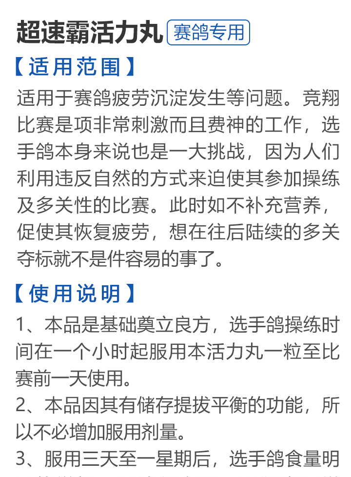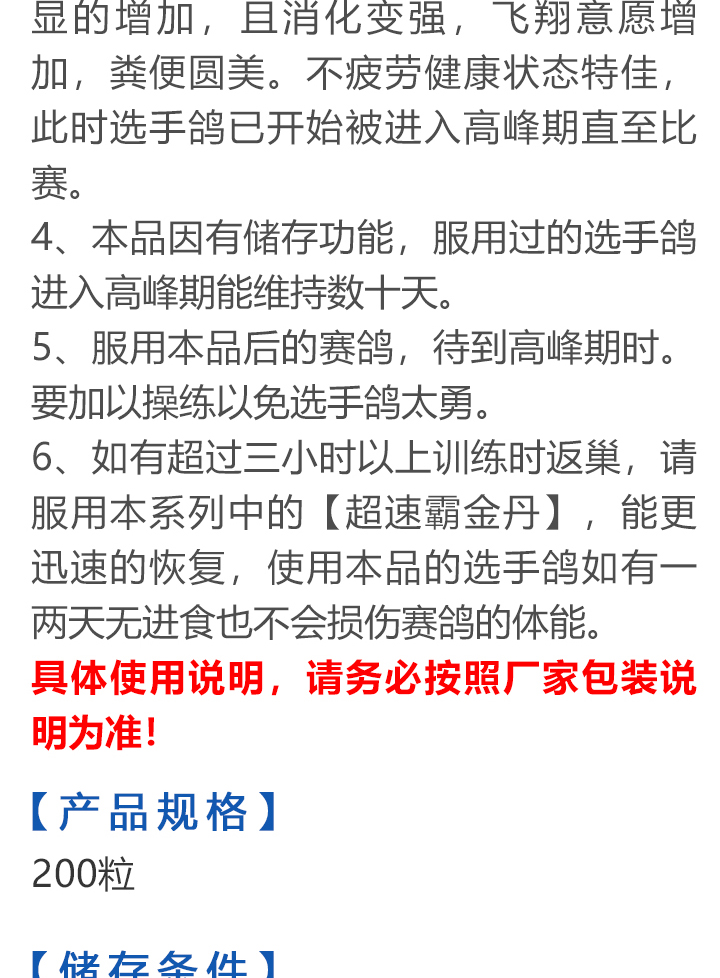 双十一•满2000-200元  -  指定商品:【爆灯】蓝精零 5克×10包 蓝色电解质/抗紧迫;【爆灯】鸽滴威 5克×10包 毛滴虫/念珠菌/黄色痰丝/乳白痰丝/喉咙白点;【爆灯】莎门停 5克×10包 副伤寒/沙门氏菌/伤寒/葡萄球菌/拉稀/水便/肠道;【爆灯】高效虫灭灵 5克×10包 五种体内虫/蛔虫/线虫/鞭毛虫/球虫/绦虫/血便/打虫;【爆灯】益南混甘 5克×10包 发热/咳嗽/流泪/歪头/张口呼吸;【爆灯】滴球快克 5克×10包 毛滴虫/球虫/二合一/喉内白点/起痰;【心连心】滴莎 10克×6袋 毛滴虫/念珠菌/喉内白点/口黄绿便;【爆灯】乎滴亢 5克×10包 呼吸道/毛滴虫/2合1;【爆灯】超浓缩喜乐菌 500毫升 活菌/大肠杆菌/减少下痢/水便;【心连心】球莎 10克×6袋 升级版配方/中西结合/迅速杀灭球虫;【爆灯】维诺护肝精 250毫升 强肝解毒/消除疲劳紧迫/促进幼鸽成长/提供维生素微量元素/调节高峰状态;【爆灯】虱螨体虫清 500毫升 杀灭体外寄生虫/螨虫/羽虱/血蜘蛛/打虫/洗澡;【爆灯】球可定 100毫升 广谱抗原虫/球虫/小肠球虫/血便/飞翔下降羽毛松乱/消瘦脱水打呵欠;【爆灯】复合预混合饲料Ⅱ维益菌 227克 肠道/绿便/水便/黄便/嗉囊炎/活菌;【爆灯】肠道宝 500克 保护胃肠道/增强肝脏解毒功能/修复肠粘膜/活菌;【心连心】莎J净 10克×6袋 升级版配方中西结合/杀灭大肠杆菌/沙门氏菌;【心连心】鸽C净 10克×6袋 升级版配方中西结合体内外寄生虫;【陈永山】金牌三冠丸 300粒 职业鸽舍保健秘方/强化幼鸽骨骼;【顶峰】复合菌(胶囊)100粒 加速消化/粪便成型/增强食欲/活菌;【爱丽丝】喉痢清(加强型) 60粒(胶囊) 羽毛松散蓬乱/呼吸困难/腹泻/咽喉溃疡/呼吸道/走路失去平衡/呼吸道;【顶峰】能量钙(浓缩型) 2.5升 纳米钙/天然骨胶原蛋白/磷钙镁锌/微量元素/骨骼发育/肠道吸收/维生素;【爱丽丝】衣原净一代 60粒(胶囊) 眼部流泪/呼吸困难/喉部粘液/喘气/打喷嚏/衣原体/单眼伤风/呼吸道;【施德福】特号六合一混合剂 5克×10包 呼吸道/毛滴虫/球虫/肠道/下痢/腺病毒;【爱丽丝】毛滴虫净 60粒(胶囊) 毛滴虫/喉部黄斑/喉部粘液/口腔白点/飞行能力下降/闭眼;【爱丽丝】刹杆净(原沙门氏菌大肠杆菌杀星) 60粒(胶囊)沙门氏菌/大肠杆菌/水便/绿便/体重减轻/关节肿胀/翅膀下垂/飞不高;【施德福】口服苗A 5克×10包 新城疫/沙门氏/腺病毒/三合一苗/禽霍乱/腺病毒/传支/传喉/鸽瘟;【爱丽丝】肝精 5克×10袋 强肝解毒/降低脂肪肝/提高免疫力/清肝明目;【施德福】卡尼丁肝肾液 250毫升 提供能量/提高视力/健脾和胃/增强体质;【施德福】精华液 250毫升 补充所需营养/维生素/恢复体力/保持巅峰/提高种鸽育种;【爱丽丝】呼吸道特号 60粒 (胶囊) 上呼吸道/口内浓痰/打喷嚏/气喘/呼吸困难/流鼻涕;【施德福】口服苗液 25毫升 肠道/呼吸道/新城疫/腺病毒/支原体/鸽瘟/六合一口服苗;【宜豪】宜豪1号免疫活菌飞速健 300锭 国际最新专利/益生菌/天然酵素/促消化/增强免疫/耐热;【宜豪】宜豪1号免疫活菌飞速健粉 800克 国际最新专利/益生菌/天然酵素/促消化/增强免疫/耐热;【天津版稳拿】稳拿一号(呼吸道) 2公克×8袋 呼吸道/催速度/霉浆菌/感冒/起痰/支气管炎/气囊炎 稳拿1号;【天津版稳拿】稳拿二号(消化肠道) 3公克×8袋 稳拿2号/肠道/沙门氏/细菌性肠炎/下痢/紧迫性水便/消化不良/食欲不振/鼻毛耸立/发育不良/活菌;【宜豪】宜豪2号转骨钙 300锭 转骨素/钙质吸收/移行抗体增强免疫力/活性矿物质/营养补充/补钙;【上海龙园】魔宝 1000克 袋装/维他矿物粉/提供钙磷等微量元素及多种必须的矿物质;【宜豪】宜豪2号转骨钙粉 800克 转骨素/钙质吸收/移行抗体增强免疫力/活性矿物质/营养补充/补钙;正版【比达斯】ASD耐力胶囊 50粒 富含B12、B15、铁/富含矿物质/增加肌肉爆发/体能耐力;正版【比达斯】康多斯(呼吸道+状态) 100克 呼吸道/状态调节/呼噜声/黑鼻;【上海龙园】维他肝精 250毫升 强肝/健肝/保肝/护肝/解毒/提高种鸽育种质量/调节体能/促高峰;【上海龙园】鸽绿茶 100克 清热解毒/清肝明目/清咽利喉/鸽感冒/消化不良/纯天然绿色植物;【上海龙园】浴宝 200克 纯天然植物/养护皮肤/洗澡/百部;【宜豪】宜豪1号免疫活菌飞速健 1000粒 国际最新专利/益生菌/天然酵素/促消化/增强免疫/耐热;【上海龙园】小育雏宝胶囊 100粒 调节种鸽育种巅峰/帮助幼鸽生长;【宜豪】宜豪2号转骨钙 500锭 转骨素/钙质吸收/移行抗体增强免疫力/活性矿物质/营养补充/补钙;【上海龙园】菌乐多 500毫升 肠道健康/肠道菌平衡/抗应激/活菌;【先锋】呼喉霸 5克×10包 微浆菌/衣原体/毛滴虫/新城疫混感;【先锋】依原净 5克×10包 不爱飞/羽毛松散/吃食少/单眼流泪/绿便/呼吸道/衣原体;【宜豪】宜豪6号神奇消化活菌粉 800克 抢料/消化好/增强营养吸收/酵素/益生菌/活菌;【宜豪】宜豪6号神奇消化活菌锭 1000锭 抢料/消化好/增强营养吸收/酵素/益生菌/活菌;【宜豪】宜豪6号神奇消化活菌锭 300锭 抢料/消化好/增强营养吸收/酵素/益生菌/活菌;【宜豪】宜豪5号天然草本全方位促进剂 60毫升 代谢残留/调节肝肾功能/消除疲劳/促进食欲;【西安凯鸽】客线枉 30毫升 腺病毒/甩拉吐/绿便/甩食/呕吐/缩头;【西安凯鸽】至尊独霸 100克 新城疫/腺病毒/抗菌消炎;【西安凯鸽】至尊独霸 60粒(胶囊) 新城疫/腺病毒/抗菌消炎;【爆灯】T5鸽疫快克 20毫升 新城疫/