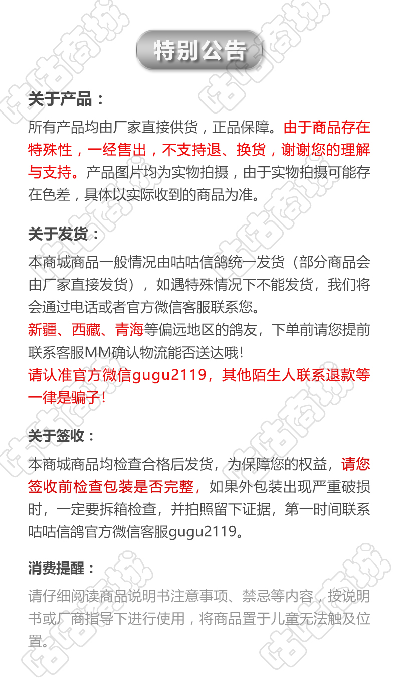 双十一•满1000-100元  -  指定商品:【爆灯】蓝精零 5克×10包 蓝色电解质/抗紧迫;【爆灯】鸽滴威 5克×10包 毛滴虫/念珠菌/黄色痰丝/乳白痰丝/喉咙白点;【爆灯】莎门停 5克×10包 副伤寒/沙门氏菌/伤寒/葡萄球菌/拉稀/水便/肠道;【爆灯】高效虫灭灵 5克×10包 五种体内虫/蛔虫/线虫/鞭毛虫/球虫/绦虫/血便/打虫;【爆灯】益南混甘 5克×10包 发热/咳嗽/流泪/歪头/张口呼吸;【爆灯】滴球快克 5克×10包 毛滴虫/球虫/二合一/喉内白点/起痰;【心连心】滴莎 10克×6袋 毛滴虫/念珠菌/喉内白点/口黄绿便;【爆灯】乎滴亢 5克×10包 呼吸道/毛滴虫/2合1;【爆灯】超浓缩喜乐菌 500毫升 活菌/大肠杆菌/减少下痢/水便;【心连心】球莎 10克×6袋 升级版配方/中西结合/迅速杀灭球虫;【爆灯】维诺护肝精 250毫升 强肝解毒/消除疲劳紧迫/促进幼鸽成长/提供维生素微量元素/调节高峰状态;【爆灯】虱螨体虫清 500毫升 杀灭体外寄生虫/螨虫/羽虱/血蜘蛛/打虫/洗澡;【爆灯】球可定 100毫升 广谱抗原虫/球虫/小肠球虫/血便/飞翔下降羽毛松乱/消瘦脱水打呵欠;【爆灯】复合预混合饲料Ⅱ维益菌 227克 肠道/绿便/水便/黄便/嗉囊炎/活菌;【爆灯】肠道宝 500克 保护胃肠道/增强肝脏解毒功能/修复肠粘膜/活菌;【心连心】莎J净 10克×6袋 升级版配方中西结合/杀灭大肠杆菌/沙门氏菌;【心连心】鸽C净 10克×6袋 升级版配方中西结合体内外寄生虫;【陈永山】金牌三冠丸 300粒 职业鸽舍保健秘方/强化幼鸽骨骼;【顶峰】复合菌(胶囊)100粒 加速消化/粪便成型/增强食欲/活菌;【爱丽丝】喉痢清(加强型) 60粒(胶囊) 羽毛松散蓬乱/呼吸困难/腹泻/咽喉溃疡/呼吸道/走路失去平衡/呼吸道;【顶峰】能量钙(浓缩型) 2.5升 纳米钙/天然骨胶原蛋白/磷钙镁锌/微量元素/骨骼发育/肠道吸收/维生素;【爱丽丝】衣原净一代 60粒(胶囊) 眼部流泪/呼吸困难/喉部粘液/喘气/打喷嚏/衣原体/单眼伤风/呼吸道;【施德福】特号六合一混合剂 5克×10包 呼吸道/毛滴虫/球虫/肠道/下痢/腺病毒;【爱丽丝】毛滴虫净 60粒(胶囊) 毛滴虫/喉部黄斑/喉部粘液/口腔白点/飞行能力下降/闭眼;【爱丽丝】刹杆净(原沙门氏菌大肠杆菌杀星) 60粒(胶囊)沙门氏菌/大肠杆菌/水便/绿便/体重减轻/关节肿胀/翅膀下垂/飞不高;【施德福】口服苗A 5克×10包 新城疫/沙门氏/腺病毒/三合一苗/禽霍乱/腺病毒/传支/传喉/鸽瘟;【爱丽丝】肝精 5克×10袋 强肝解毒/降低脂肪肝/提高免疫力/清肝明目;【施德福】卡尼丁肝肾液 250毫升 提供能量/提高视力/健脾和胃/增强体质;【施德福】精华液 250毫升 补充所需营养/维生素/恢复体力/保持巅峰/提高种鸽育种;【爱丽丝】呼吸道特号 60粒 (胶囊) 上呼吸道/口内浓痰/打喷嚏/气喘/呼吸困难/流鼻涕;【施德福】口服苗液 25毫升 肠道/呼吸道/新城疫/腺病毒/支原体/鸽瘟/六合一口服苗;【宜豪】宜豪1号免疫活菌飞速健 300锭 国际最新专利/益生菌/天然酵素/促消化/增强免疫/耐热;【宜豪】宜豪1号免疫活菌飞速健粉 800克 国际最新专利/益生菌/天然酵素/促消化/增强免疫/耐热;【天津版稳拿】稳拿一号(呼吸道) 2公克×8袋 呼吸道/催速度/霉浆菌/感冒/起痰/支气管炎/气囊炎 稳拿1号;【天津版稳拿】稳拿二号(消化肠道) 3公克×8袋 稳拿2号/肠道/沙门氏/细菌性肠炎/下痢/紧迫性水便/消化不良/食欲不振/鼻毛耸立/发育不良/活菌;【宜豪】宜豪2号转骨钙 300锭 转骨素/钙质吸收/移行抗体增强免疫力/活性矿物质/营养补充/补钙;【上海龙园】魔宝 1000克 袋装/维他矿物粉/提供钙磷等微量元素及多种必须的矿物质;【宜豪】宜豪2号转骨钙粉 800克 转骨素/钙质吸收/移行抗体增强免疫力/活性矿物质/营养补充/补钙;正版【比达斯】ASD耐力胶囊 50粒 富含B12、B15、铁/富含矿物质/增加肌肉爆发/体能耐力;正版【比达斯】康多斯(呼吸道+状态) 100克 呼吸道/状态调节/呼噜声/黑鼻;【上海龙园】维他肝精 250毫升 强肝/健肝/保肝/护肝/解毒/提高种鸽育种质量/调节体能/促高峰;【上海龙园】鸽绿茶 100克 清热解毒/清肝明目/清咽利喉/鸽感冒/消化不良/纯天然绿色植物;【上海龙园】浴宝 200克 纯天然植物/养护皮肤/洗澡/百部;【宜豪】宜豪1号免疫活菌飞速健 1000粒 国际最新专利/益生菌/天然酵素/促消化/增强免疫/耐热;【上海龙园】小育雏宝胶囊 100粒 调节种鸽育种巅峰/帮助幼鸽生长;【宜豪】宜豪2号转骨钙 500锭 转骨素/钙质吸收/移行抗体增强免疫力/活性矿物质/营养补充/补钙;【上海龙园】菌乐多 500毫升 肠道健康/肠道菌平衡/抗应激/活菌;【先锋】呼喉霸 5克×10包 微浆菌/衣原体/毛滴虫/新城疫混感;【先锋】依原净 5克×10包 不爱飞/羽毛松散/吃食少/单眼流泪/绿便/呼吸道/衣原体;【宜豪】宜豪6号神奇消化活菌粉 800克 抢料/消化好/增强营养吸收/酵素/益生菌/活菌;【宜豪】宜豪6号神奇消化活菌锭 1000锭 抢料/消化好/增强营养吸收/酵素/益生菌/活菌;【宜豪】宜豪6号神奇消化活菌锭 300锭 抢料/消化好/增强营养吸收/酵素/益生菌/活菌;【宜豪】宜豪5号天然草本全方位促进剂 60毫升 代谢残留/调节肝肾功能/消除疲劳/促进食欲;【西安凯鸽】客线枉 30毫升 腺病毒/甩拉吐/绿便/甩食/呕吐/缩头;【西安凯鸽】至尊独霸 100克 新城疫/腺病毒/抗菌消炎;【西安凯鸽】至尊独霸 60粒(胶囊) 新城疫/腺病毒/抗菌消炎;【爆灯】T5鸽疫快克 20毫升 新城疫/