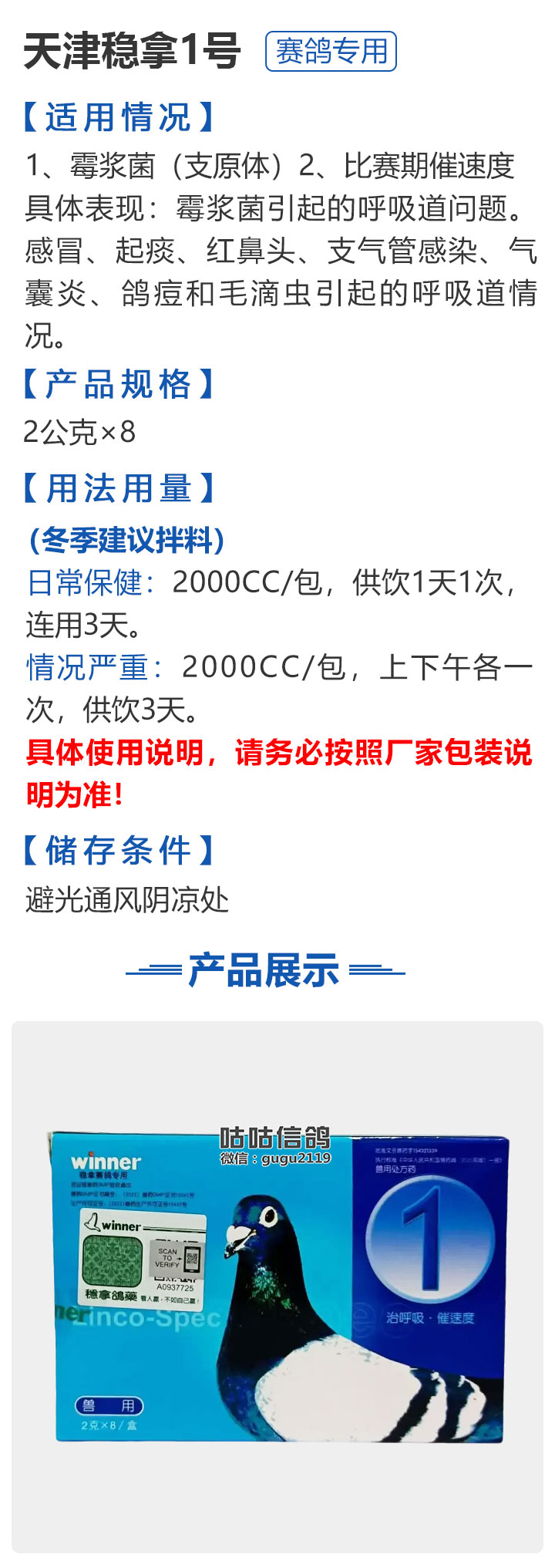 2025双节同庆•满1500-150元  -  指定商品:【爆灯】蓝精零 5克×10包 蓝色电解质/抗紧迫;【爆灯】鸽滴威 5克×10包 毛滴虫/念珠菌/黄色痰丝/乳白痰丝/喉咙白点;【爆灯】莎门停 5克×10包 副伤寒/沙门氏菌/伤寒/葡萄球菌/拉稀/水便/肠道;【爆灯】高效虫灭灵 5克×10包 五种体内虫/蛔虫/线虫/鞭毛虫/球虫/绦虫/血便/打虫;【爆灯】益南混甘 5克×10包 发热/咳嗽/流泪/歪头/张口呼吸;【爆灯】滴球快克 5克×10包 毛滴虫/球虫/二合一/喉内白点/起痰;【心连心】滴莎 10克×6袋 毛滴虫/念珠菌/喉内白点/口黄绿便;【爆灯】乎滴亢 5克×10包 呼吸道/毛滴虫/2合1;【爆灯】超浓缩喜乐菌 500毫升 活菌/大肠杆菌/减少下痢/水便;【心连心】球莎 10克×6袋 升级版配方/中西结合/迅速杀灭球虫;【爆灯】维诺护肝精 250毫升 强肝解毒/消除疲劳紧迫/促进幼鸽成长/提供维生素微量元素/调节高峰状态;【爆灯】虱螨体虫清 500毫升 杀灭体外寄生虫/螨虫/羽虱/血蜘蛛/打虫/洗澡;【爆灯】球可定 100毫升 广谱抗原虫/球虫/小肠球虫/血便/飞翔下降羽毛松乱/消瘦脱水打呵欠;【爆灯】复合预混合饲料Ⅱ维益菌 227克 肠道/绿便/水便/黄便/嗉囊炎/活菌;【爆灯】肠道宝 500克 保护胃肠道/增强肝脏解毒功能/修复肠粘膜/活菌;【心连心】莎J净 10克×6袋 升级版配方中西结合/杀灭大肠杆菌/沙门氏菌;【心连心】鸽C净 10克×6袋 升级版配方中西结合体内外寄生虫;【陈永山】金牌三冠丸 300粒 职业鸽舍保健秘方/强化幼鸽骨骼;【顶峰】复合菌(胶囊)100粒 加速消化/粪便成型/增强食欲/活菌;【爱丽丝】喉痢清(加强型) 60粒(胶囊) 羽毛松散蓬乱/呼吸困难/腹泻/咽喉溃疡/呼吸道/走路失去平衡/呼吸道;【顶峰】能量钙(浓缩型) 2.5升 纳米钙/天然骨胶原蛋白/磷钙镁锌/微量元素/骨骼发育/肠道吸收/维生素;【爱丽丝】衣原净一代 60粒(胶囊) 眼部流泪/呼吸困难/喉部粘液/喘气/打喷嚏/衣原体/单眼伤风/呼吸道;【施德福】特号六合一混合剂 5克×10包 呼吸道/毛滴虫/球虫/肠道/下痢/腺病毒;【爱丽丝】毛滴虫净 60粒(胶囊) 毛滴虫/喉部黄斑/喉部粘液/口腔白点/飞行能力下降/闭眼;【爱丽丝】刹杆净(原沙门氏菌大肠杆菌杀星) 60粒(胶囊)沙门氏菌/大肠杆菌/水便/绿便/体重减轻/关节肿胀/翅膀下垂/飞不高;【爱丽丝】肝精 5克×10袋 强肝解毒/降低脂肪肝/提高免疫力/清肝明目;【施德福】卡尼丁肝肾液 250毫升 提供能量/提高视力/健脾和胃/增强体质;2026.7.2到期【施德福】精华液 250毫升 补充所需营养/维生素/恢复体力/保持巅峰/提高种鸽育种;【爱丽丝】呼吸道特号 60粒 (胶囊) 上呼吸道/口内浓痰/打喷嚏/气喘/呼吸困难/流鼻涕;【施德福】口服苗液 25毫升 肠道/呼吸道/新城疫/腺病毒/支原体/鸽瘟/六合一口服苗;【宜豪】宜豪1号免疫活菌飞速健 300锭 国际最新专利/益生菌/天然酵素/促消化/增强免疫/耐热;【宜豪】宜豪1号免疫活菌飞速健粉 800克 国际最新专利/益生菌/天然酵素/促消化/增强免疫/耐热;【天津版稳拿】稳拿二号(消化肠道) 3公克×8袋 稳拿2号/肠道/沙门氏/细菌性肠炎/下痢/紧迫性水便/消化不良/食欲不振/鼻毛耸立/发育不良/活菌;【宜豪】宜豪2号转骨钙 300锭 转骨素/钙质吸收/移行抗体增强免疫力/活性矿物质/营养补充/补钙;【天津版稳拿】稳拿七号(毛滴虫) 2公克×8袋 毛滴虫/黑鼻头/口内痰丝/喉咙白点/水便/虚弱/食欲减退/羽毛松乱/幼鸽发育不良 稳拿7号;【上海龙园】魔宝 1000克 袋装/维他矿物粉/提供钙磷等微量元素及多种必须的矿物质;【宜豪】宜豪2号转骨钙粉 800克 转骨素/钙质吸收/移行抗体增强免疫力/活性矿物质/营养补充/补钙;正版【比达斯】ASD耐力胶囊 50粒 富含B12、B15、铁/富含矿物质/增加肌肉爆发/体能耐力;正版【比达斯】康多斯(呼吸道+状态) 100克 呼吸道/状态调节/呼噜声/黑鼻;【上海龙园】维他肝精 250毫升 强肝/健肝/保肝/护肝/解毒/提高种鸽育种质量/调节体能/促高峰;【上海龙园】鸽绿茶 100克 清热解毒/清肝明目/清咽利喉/鸽感冒/消化不良/纯天然绿色植物;【宜豪】宜豪1号免疫活菌飞速健 1000粒 国际最新专利/益生菌/天然酵素/促消化/增强免疫/耐热;【上海龙园】小育雏宝胶囊 100粒 调节种鸽育种巅峰/帮助幼鸽生长;【宜豪】宜豪2号转骨钙 500锭 转骨素/钙质吸收/移行抗体增强免疫力/活性矿物质/营养补充/补钙;【上海龙园】菌乐多 500毫升 肠道健康/肠道菌平衡/抗应激/活菌;【先锋】呼喉霸 5克×10包 微浆菌/衣原体/毛滴虫/新城疫混感;【先锋】依原净 5克×10包 不爱飞/羽毛松散/吃食少/单眼流泪/绿便/呼吸道/衣原体;【宜豪】宜豪6号神奇消化活菌粉 800克 抢料/消化好/增强营养吸收/酵素/益生菌/活菌;【宜豪】宜豪6号神奇消化活菌锭 1000锭 抢料/消化好/增强营养吸收/酵素/益生菌/活菌;【宜豪】宜豪6号神奇消化活菌锭 300锭 抢料/消化好/增强营养吸收/酵素/益生菌/活菌;【宜豪】宜豪5号天然草本全方位促进剂 60毫升 代谢残留/调节肝肾功能/消除疲劳/促进食欲;【西安凯鸽】客线枉 30毫升 腺病毒/甩拉吐/绿便/甩食/呕吐/缩头;【西安凯鸽】至尊独霸 100克 新城疫/腺病毒/抗菌消炎;【西安凯鸽】至尊独霸 60粒(胶囊) 新城疫/腺病毒/抗菌消炎;【爆灯】T5鸽疫快克 20毫升 新城疫/腺病毒/疱疹病毒/鸽痘/流感/特异性免疫因子;【西安凯鸽】果蔬营养丸 700克 改善肠道/提高体能/补充维生