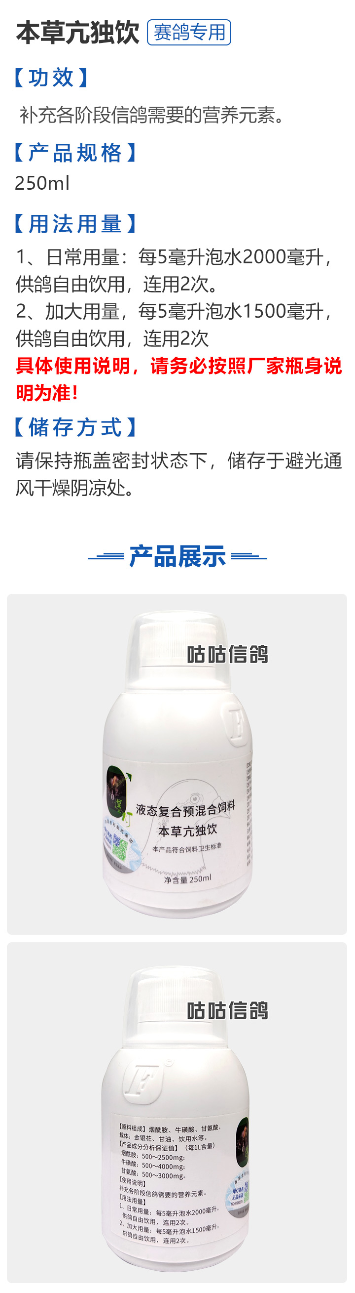 2025双节同庆•满1500-150元  -  指定商品:【爆灯】蓝精零 5克×10包 蓝色电解质/抗紧迫;【爆灯】鸽滴威 5克×10包 毛滴虫/念珠菌/黄色痰丝/乳白痰丝/喉咙白点;【爆灯】莎门停 5克×10包 副伤寒/沙门氏菌/伤寒/葡萄球菌/拉稀/水便/肠道;【爆灯】高效虫灭灵 5克×10包 五种体内虫/蛔虫/线虫/鞭毛虫/球虫/绦虫/血便/打虫;【爆灯】益南混甘 5克×10包 发热/咳嗽/流泪/歪头/张口呼吸;【爆灯】滴球快克 5克×10包 毛滴虫/球虫/二合一/喉内白点/起痰;【心连心】滴莎 10克×6袋 毛滴虫/念珠菌/喉内白点/口黄绿便;【爆灯】乎滴亢 5克×10包 呼吸道/毛滴虫/2合1;【爆灯】超浓缩喜乐菌 500毫升 活菌/大肠杆菌/减少下痢/水便;【心连心】球莎 10克×6袋 升级版配方/中西结合/迅速杀灭球虫;【爆灯】维诺护肝精 250毫升 强肝解毒/消除疲劳紧迫/促进幼鸽成长/提供维生素微量元素/调节高峰状态;【爆灯】虱螨体虫清 500毫升 杀灭体外寄生虫/螨虫/羽虱/血蜘蛛/打虫/洗澡;【爆灯】球可定 100毫升 广谱抗原虫/球虫/小肠球虫/血便/飞翔下降羽毛松乱/消瘦脱水打呵欠;【爆灯】复合预混合饲料Ⅱ维益菌 227克 肠道/绿便/水便/黄便/嗉囊炎/活菌;【爆灯】肠道宝 500克 保护胃肠道/增强肝脏解毒功能/修复肠粘膜/活菌;【心连心】莎J净 10克×6袋 升级版配方中西结合/杀灭大肠杆菌/沙门氏菌;【心连心】鸽C净 10克×6袋 升级版配方中西结合体内外寄生虫;【陈永山】金牌三冠丸 300粒 职业鸽舍保健秘方/强化幼鸽骨骼;【顶峰】复合菌(胶囊)100粒 加速消化/粪便成型/增强食欲/活菌;【爱丽丝】喉痢清(加强型) 60粒(胶囊) 羽毛松散蓬乱/呼吸困难/腹泻/咽喉溃疡/呼吸道/走路失去平衡/呼吸道;【顶峰】能量钙(浓缩型) 2.5升 纳米钙/天然骨胶原蛋白/磷钙镁锌/微量元素/骨骼发育/肠道吸收/维生素;【爱丽丝】衣原净一代 60粒(胶囊) 眼部流泪/呼吸困难/喉部粘液/喘气/打喷嚏/衣原体/单眼伤风/呼吸道;【施德福】特号六合一混合剂 5克×10包 呼吸道/毛滴虫/球虫/肠道/下痢/腺病毒;【爱丽丝】毛滴虫净 60粒(胶囊) 毛滴虫/喉部黄斑/喉部粘液/口腔白点/飞行能力下降/闭眼;【爱丽丝】刹杆净(原沙门氏菌大肠杆菌杀星) 60粒(胶囊)沙门氏菌/大肠杆菌/水便/绿便/体重减轻/关节肿胀/翅膀下垂/飞不高;【爱丽丝】肝精 5克×10袋 强肝解毒/降低脂肪肝/提高免疫力/清肝明目;【施德福】卡尼丁肝肾液 250毫升 提供能量/提高视力/健脾和胃/增强体质;2026.7.2到期【施德福】精华液 250毫升 补充所需营养/维生素/恢复体力/保持巅峰/提高种鸽育种;【爱丽丝】呼吸道特号 60粒 (胶囊) 上呼吸道/口内浓痰/打喷嚏/气喘/呼吸困难/流鼻涕;【施德福】口服苗液 25毫升 肠道/呼吸道/新城疫/腺病毒/支原体/鸽瘟/六合一口服苗;【宜豪】宜豪1号免疫活菌飞速健 300锭 国际最新专利/益生菌/天然酵素/促消化/增强免疫/耐热;【宜豪】宜豪1号免疫活菌飞速健粉 800克 国际最新专利/益生菌/天然酵素/促消化/增强免疫/耐热;【天津版稳拿】稳拿二号(消化肠道) 3公克×8袋 稳拿2号/肠道/沙门氏/细菌性肠炎/下痢/紧迫性水便/消化不良/食欲不振/鼻毛耸立/发育不良/活菌;【宜豪】宜豪2号转骨钙 300锭 转骨素/钙质吸收/移行抗体增强免疫力/活性矿物质/营养补充/补钙;【天津版稳拿】稳拿七号(毛滴虫) 2公克×8袋 毛滴虫/黑鼻头/口内痰丝/喉咙白点/水便/虚弱/食欲减退/羽毛松乱/幼鸽发育不良 稳拿7号;【上海龙园】魔宝 1000克 袋装/维他矿物粉/提供钙磷等微量元素及多种必须的矿物质;【宜豪】宜豪2号转骨钙粉 800克 转骨素/钙质吸收/移行抗体增强免疫力/活性矿物质/营养补充/补钙;正版【比达斯】ASD耐力胶囊 50粒 富含B12、B15、铁/富含矿物质/增加肌肉爆发/体能耐力;正版【比达斯】康多斯(呼吸道+状态) 100克 呼吸道/状态调节/呼噜声/黑鼻;【上海龙园】维他肝精 250毫升 强肝/健肝/保肝/护肝/解毒/提高种鸽育种质量/调节体能/促高峰;【上海龙园】鸽绿茶 100克 清热解毒/清肝明目/清咽利喉/鸽感冒/消化不良/纯天然绿色植物;【宜豪】宜豪1号免疫活菌飞速健 1000粒 国际最新专利/益生菌/天然酵素/促消化/增强免疫/耐热;【上海龙园】小育雏宝胶囊 100粒 调节种鸽育种巅峰/帮助幼鸽生长;【宜豪】宜豪2号转骨钙 500锭 转骨素/钙质吸收/移行抗体增强免疫力/活性矿物质/营养补充/补钙;【上海龙园】菌乐多 500毫升 肠道健康/肠道菌平衡/抗应激/活菌;【先锋】呼喉霸 5克×10包 微浆菌/衣原体/毛滴虫/新城疫混感;【先锋】依原净 5克×10包 不爱飞/羽毛松散/吃食少/单眼流泪/绿便/呼吸道/衣原体;【宜豪】宜豪6号神奇消化活菌粉 800克 抢料/消化好/增强营养吸收/酵素/益生菌/活菌;【宜豪】宜豪6号神奇消化活菌锭 1000锭 抢料/消化好/增强营养吸收/酵素/益生菌/活菌;【宜豪】宜豪6号神奇消化活菌锭 300锭 抢料/消化好/增强营养吸收/酵素/益生菌/活菌;【宜豪】宜豪5号天然草本全方位促进剂 60毫升 代谢残留/调节肝肾功能/消除疲劳/促进食欲;【西安凯鸽】客线枉 30毫升 腺病毒/甩拉吐/绿便/甩食/呕吐/缩头;【西安凯鸽】至尊独霸 100克 新城疫/腺病毒/抗菌消炎;【西安凯鸽】至尊独霸 60粒(胶囊) 新城疫/腺病毒/抗菌消炎;【爆灯】T5鸽疫快克 20毫升 新城疫/腺病毒/疱疹病毒/鸽痘/流感/特异性免疫因子;【西安凯鸽】果蔬营养丸 700克 改善肠道/提高体能/补充维生