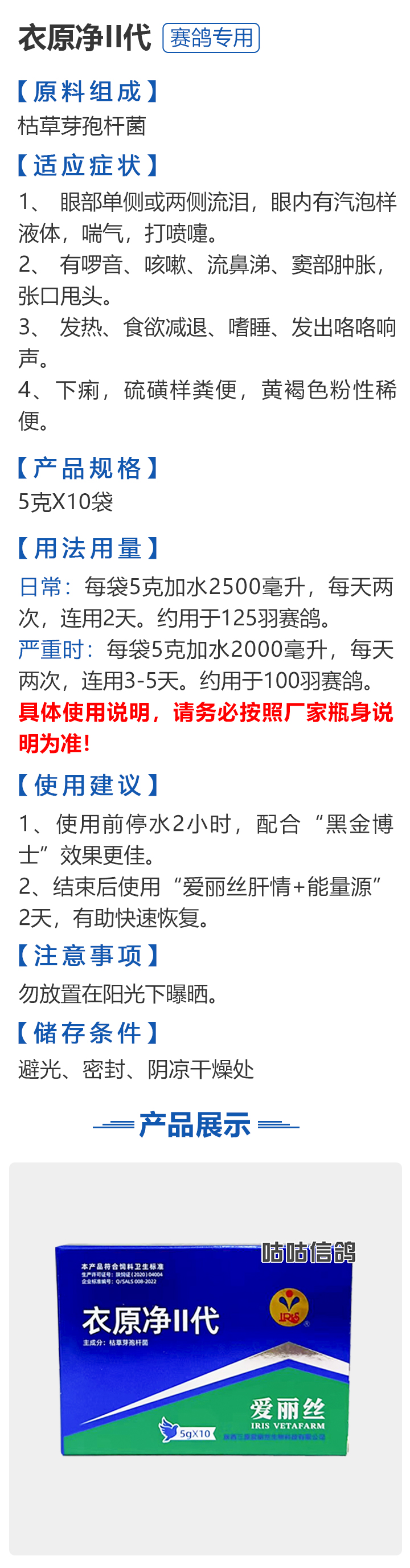 2025双节同庆•满1500-150元  -  指定商品:【爆灯】蓝精零 5克×10包 蓝色电解质/抗紧迫;【爆灯】鸽滴威 5克×10包 毛滴虫/念珠菌/黄色痰丝/乳白痰丝/喉咙白点;【爆灯】莎门停 5克×10包 副伤寒/沙门氏菌/伤寒/葡萄球菌/拉稀/水便/肠道;【爆灯】高效虫灭灵 5克×10包 五种体内虫/蛔虫/线虫/鞭毛虫/球虫/绦虫/血便/打虫;【爆灯】益南混甘 5克×10包 发热/咳嗽/流泪/歪头/张口呼吸;【爆灯】滴球快克 5克×10包 毛滴虫/球虫/二合一/喉内白点/起痰;【心连心】滴莎 10克×6袋 毛滴虫/念珠菌/喉内白点/口黄绿便;【爆灯】乎滴亢 5克×10包 呼吸道/毛滴虫/2合1;【爆灯】超浓缩喜乐菌 500毫升 活菌/大肠杆菌/减少下痢/水便;【心连心】球莎 10克×6袋 升级版配方/中西结合/迅速杀灭球虫;【爆灯】维诺护肝精 250毫升 强肝解毒/消除疲劳紧迫/促进幼鸽成长/提供维生素微量元素/调节高峰状态;【爆灯】虱螨体虫清 500毫升 杀灭体外寄生虫/螨虫/羽虱/血蜘蛛/打虫/洗澡;【爆灯】球可定 100毫升 广谱抗原虫/球虫/小肠球虫/血便/飞翔下降羽毛松乱/消瘦脱水打呵欠;【爆灯】复合预混合饲料Ⅱ维益菌 227克 肠道/绿便/水便/黄便/嗉囊炎/活菌;【爆灯】肠道宝 500克 保护胃肠道/增强肝脏解毒功能/修复肠粘膜/活菌;【心连心】莎J净 10克×6袋 升级版配方中西结合/杀灭大肠杆菌/沙门氏菌;【心连心】鸽C净 10克×6袋 升级版配方中西结合体内外寄生虫;【陈永山】金牌三冠丸 300粒 职业鸽舍保健秘方/强化幼鸽骨骼;【顶峰】复合菌(胶囊)100粒 加速消化/粪便成型/增强食欲/活菌;【爱丽丝】喉痢清(加强型) 60粒(胶囊) 羽毛松散蓬乱/呼吸困难/腹泻/咽喉溃疡/呼吸道/走路失去平衡/呼吸道;【顶峰】能量钙(浓缩型) 2.5升 纳米钙/天然骨胶原蛋白/磷钙镁锌/微量元素/骨骼发育/肠道吸收/维生素;【爱丽丝】衣原净一代 60粒(胶囊) 眼部流泪/呼吸困难/喉部粘液/喘气/打喷嚏/衣原体/单眼伤风/呼吸道;【施德福】特号六合一混合剂 5克×10包 呼吸道/毛滴虫/球虫/肠道/下痢/腺病毒;【爱丽丝】毛滴虫净 60粒(胶囊) 毛滴虫/喉部黄斑/喉部粘液/口腔白点/飞行能力下降/闭眼;【爱丽丝】刹杆净(原沙门氏菌大肠杆菌杀星) 60粒(胶囊)沙门氏菌/大肠杆菌/水便/绿便/体重减轻/关节肿胀/翅膀下垂/飞不高;【爱丽丝】肝精 5克×10袋 强肝解毒/降低脂肪肝/提高免疫力/清肝明目;【施德福】卡尼丁肝肾液 250毫升 提供能量/提高视力/健脾和胃/增强体质;2026.7.2到期【施德福】精华液 250毫升 补充所需营养/维生素/恢复体力/保持巅峰/提高种鸽育种;【爱丽丝】呼吸道特号 60粒 (胶囊) 上呼吸道/口内浓痰/打喷嚏/气喘/呼吸困难/流鼻涕;【施德福】口服苗液 25毫升 肠道/呼吸道/新城疫/腺病毒/支原体/鸽瘟/六合一口服苗;【宜豪】宜豪1号免疫活菌飞速健 300锭 国际最新专利/益生菌/天然酵素/促消化/增强免疫/耐热;【宜豪】宜豪1号免疫活菌飞速健粉 800克 国际最新专利/益生菌/天然酵素/促消化/增强免疫/耐热;【天津版稳拿】稳拿二号(消化肠道) 3公克×8袋 稳拿2号/肠道/沙门氏/细菌性肠炎/下痢/紧迫性水便/消化不良/食欲不振/鼻毛耸立/发育不良/活菌;【宜豪】宜豪2号转骨钙 300锭 转骨素/钙质吸收/移行抗体增强免疫力/活性矿物质/营养补充/补钙;【天津版稳拿】稳拿七号(毛滴虫) 2公克×8袋 毛滴虫/黑鼻头/口内痰丝/喉咙白点/水便/虚弱/食欲减退/羽毛松乱/幼鸽发育不良 稳拿7号;【上海龙园】魔宝 1000克 袋装/维他矿物粉/提供钙磷等微量元素及多种必须的矿物质;【宜豪】宜豪2号转骨钙粉 800克 转骨素/钙质吸收/移行抗体增强免疫力/活性矿物质/营养补充/补钙;正版【比达斯】ASD耐力胶囊 50粒 富含B12、B15、铁/富含矿物质/增加肌肉爆发/体能耐力;正版【比达斯】康多斯(呼吸道+状态) 100克 呼吸道/状态调节/呼噜声/黑鼻;【上海龙园】维他肝精 250毫升 强肝/健肝/保肝/护肝/解毒/提高种鸽育种质量/调节体能/促高峰;【上海龙园】鸽绿茶 100克 清热解毒/清肝明目/清咽利喉/鸽感冒/消化不良/纯天然绿色植物;【宜豪】宜豪1号免疫活菌飞速健 1000粒 国际最新专利/益生菌/天然酵素/促消化/增强免疫/耐热;【上海龙园】小育雏宝胶囊 100粒 调节种鸽育种巅峰/帮助幼鸽生长;【宜豪】宜豪2号转骨钙 500锭 转骨素/钙质吸收/移行抗体增强免疫力/活性矿物质/营养补充/补钙;【上海龙园】菌乐多 500毫升 肠道健康/肠道菌平衡/抗应激/活菌;【先锋】呼喉霸 5克×10包 微浆菌/衣原体/毛滴虫/新城疫混感;【先锋】依原净 5克×10包 不爱飞/羽毛松散/吃食少/单眼流泪/绿便/呼吸道/衣原体;【宜豪】宜豪6号神奇消化活菌粉 800克 抢料/消化好/增强营养吸收/酵素/益生菌/活菌;【宜豪】宜豪6号神奇消化活菌锭 1000锭 抢料/消化好/增强营养吸收/酵素/益生菌/活菌;【宜豪】宜豪6号神奇消化活菌锭 300锭 抢料/消化好/增强营养吸收/酵素/益生菌/活菌;【宜豪】宜豪5号天然草本全方位促进剂 60毫升 代谢残留/调节肝肾功能/消除疲劳/促进食欲;【西安凯鸽】客线枉 30毫升 腺病毒/甩拉吐/绿便/甩食/呕吐/缩头;【西安凯鸽】至尊独霸 100克 新城疫/腺病毒/抗菌消炎;【西安凯鸽】至尊独霸 60粒(胶囊) 新城疫/腺病毒/抗菌消炎;【爆灯】T5鸽疫快克 20毫升 新城疫/腺病毒/疱疹病毒/鸽痘/流感/特异性免疫因子;【西安凯鸽】果蔬营养丸 700克 改善肠道/提高体能/补充维生