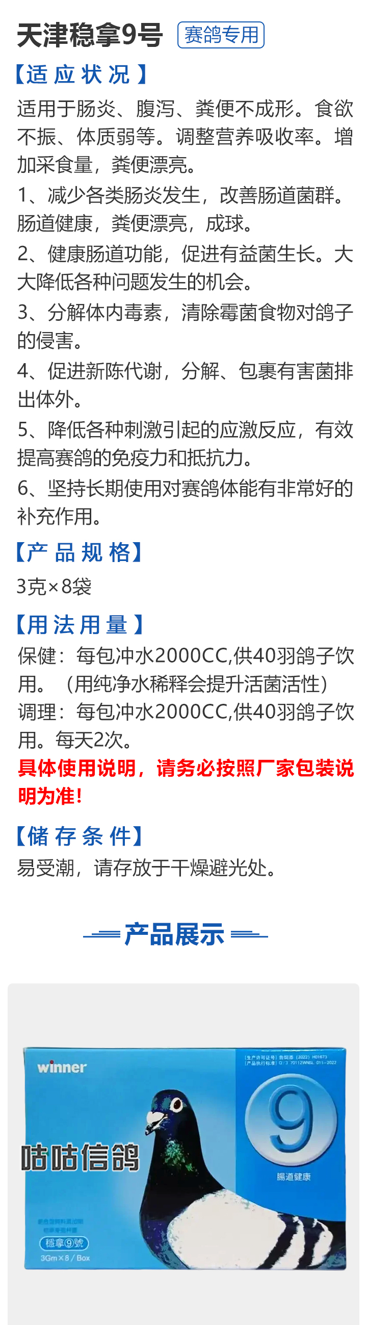 2025双节同庆•满1500-150元  -  指定商品:【爆灯】蓝精零 5克×10包 蓝色电解质/抗紧迫;【爆灯】鸽滴威 5克×10包 毛滴虫/念珠菌/黄色痰丝/乳白痰丝/喉咙白点;【爆灯】莎门停 5克×10包 副伤寒/沙门氏菌/伤寒/葡萄球菌/拉稀/水便/肠道;【爆灯】高效虫灭灵 5克×10包 五种体内虫/蛔虫/线虫/鞭毛虫/球虫/绦虫/血便/打虫;【爆灯】益南混甘 5克×10包 发热/咳嗽/流泪/歪头/张口呼吸;【爆灯】滴球快克 5克×10包 毛滴虫/球虫/二合一/喉内白点/起痰;【心连心】滴莎 10克×6袋 毛滴虫/念珠菌/喉内白点/口黄绿便;【爆灯】乎滴亢 5克×10包 呼吸道/毛滴虫/2合1;【爆灯】超浓缩喜乐菌 500毫升 活菌/大肠杆菌/减少下痢/水便;【心连心】球莎 10克×6袋 升级版配方/中西结合/迅速杀灭球虫;【爆灯】维诺护肝精 250毫升 强肝解毒/消除疲劳紧迫/促进幼鸽成长/提供维生素微量元素/调节高峰状态;【爆灯】虱螨体虫清 500毫升 杀灭体外寄生虫/螨虫/羽虱/血蜘蛛/打虫/洗澡;【爆灯】球可定 100毫升 广谱抗原虫/球虫/小肠球虫/血便/飞翔下降羽毛松乱/消瘦脱水打呵欠;【爆灯】复合预混合饲料Ⅱ维益菌 227克 肠道/绿便/水便/黄便/嗉囊炎/活菌;【爆灯】肠道宝 500克 保护胃肠道/增强肝脏解毒功能/修复肠粘膜/活菌;【心连心】莎J净 10克×6袋 升级版配方中西结合/杀灭大肠杆菌/沙门氏菌;【心连心】鸽C净 10克×6袋 升级版配方中西结合体内外寄生虫;【陈永山】金牌三冠丸 300粒 职业鸽舍保健秘方/强化幼鸽骨骼;【顶峰】复合菌(胶囊)100粒 加速消化/粪便成型/增强食欲/活菌;【爱丽丝】喉痢清(加强型) 60粒(胶囊) 羽毛松散蓬乱/呼吸困难/腹泻/咽喉溃疡/呼吸道/走路失去平衡/呼吸道;【顶峰】能量钙(浓缩型) 2.5升 纳米钙/天然骨胶原蛋白/磷钙镁锌/微量元素/骨骼发育/肠道吸收/维生素;【爱丽丝】衣原净一代 60粒(胶囊) 眼部流泪/呼吸困难/喉部粘液/喘气/打喷嚏/衣原体/单眼伤风/呼吸道;【施德福】特号六合一混合剂 5克×10包 呼吸道/毛滴虫/球虫/肠道/下痢/腺病毒;【爱丽丝】毛滴虫净 60粒(胶囊) 毛滴虫/喉部黄斑/喉部粘液/口腔白点/飞行能力下降/闭眼;【爱丽丝】刹杆净(原沙门氏菌大肠杆菌杀星) 60粒(胶囊)沙门氏菌/大肠杆菌/水便/绿便/体重减轻/关节肿胀/翅膀下垂/飞不高;【爱丽丝】肝精 5克×10袋 强肝解毒/降低脂肪肝/提高免疫力/清肝明目;【施德福】卡尼丁肝肾液 250毫升 提供能量/提高视力/健脾和胃/增强体质;2026.7.2到期【施德福】精华液 250毫升 补充所需营养/维生素/恢复体力/保持巅峰/提高种鸽育种;【爱丽丝】呼吸道特号 60粒 (胶囊) 上呼吸道/口内浓痰/打喷嚏/气喘/呼吸困难/流鼻涕;【施德福】口服苗液 25毫升 肠道/呼吸道/新城疫/腺病毒/支原体/鸽瘟/六合一口服苗;【宜豪】宜豪1号免疫活菌飞速健 300锭 国际最新专利/益生菌/天然酵素/促消化/增强免疫/耐热;【宜豪】宜豪1号免疫活菌飞速健粉 800克 国际最新专利/益生菌/天然酵素/促消化/增强免疫/耐热;【天津版稳拿】稳拿二号(消化肠道) 3公克×8袋 稳拿2号/肠道/沙门氏/细菌性肠炎/下痢/紧迫性水便/消化不良/食欲不振/鼻毛耸立/发育不良/活菌;【宜豪】宜豪2号转骨钙 300锭 转骨素/钙质吸收/移行抗体增强免疫力/活性矿物质/营养补充/补钙;【天津版稳拿】稳拿七号(毛滴虫) 2公克×8袋 毛滴虫/黑鼻头/口内痰丝/喉咙白点/水便/虚弱/食欲减退/羽毛松乱/幼鸽发育不良 稳拿7号;【上海龙园】魔宝 1000克 袋装/维他矿物粉/提供钙磷等微量元素及多种必须的矿物质;【宜豪】宜豪2号转骨钙粉 800克 转骨素/钙质吸收/移行抗体增强免疫力/活性矿物质/营养补充/补钙;正版【比达斯】ASD耐力胶囊 50粒 富含B12、B15、铁/富含矿物质/增加肌肉爆发/体能耐力;正版【比达斯】康多斯(呼吸道+状态) 100克 呼吸道/状态调节/呼噜声/黑鼻;【上海龙园】维他肝精 250毫升 强肝/健肝/保肝/护肝/解毒/提高种鸽育种质量/调节体能/促高峰;【上海龙园】鸽绿茶 100克 清热解毒/清肝明目/清咽利喉/鸽感冒/消化不良/纯天然绿色植物;【宜豪】宜豪1号免疫活菌飞速健 1000粒 国际最新专利/益生菌/天然酵素/促消化/增强免疫/耐热;【上海龙园】小育雏宝胶囊 100粒 调节种鸽育种巅峰/帮助幼鸽生长;【宜豪】宜豪2号转骨钙 500锭 转骨素/钙质吸收/移行抗体增强免疫力/活性矿物质/营养补充/补钙;【上海龙园】菌乐多 500毫升 肠道健康/肠道菌平衡/抗应激/活菌;【先锋】呼喉霸 5克×10包 微浆菌/衣原体/毛滴虫/新城疫混感;【先锋】依原净 5克×10包 不爱飞/羽毛松散/吃食少/单眼流泪/绿便/呼吸道/衣原体;【宜豪】宜豪6号神奇消化活菌粉 800克 抢料/消化好/增强营养吸收/酵素/益生菌/活菌;【宜豪】宜豪6号神奇消化活菌锭 1000锭 抢料/消化好/增强营养吸收/酵素/益生菌/活菌;【宜豪】宜豪6号神奇消化活菌锭 300锭 抢料/消化好/增强营养吸收/酵素/益生菌/活菌;【宜豪】宜豪5号天然草本全方位促进剂 60毫升 代谢残留/调节肝肾功能/消除疲劳/促进食欲;【西安凯鸽】客线枉 30毫升 腺病毒/甩拉吐/绿便/甩食/呕吐/缩头;【西安凯鸽】至尊独霸 100克 新城疫/腺病毒/抗菌消炎;【西安凯鸽】至尊独霸 60粒(胶囊) 新城疫/腺病毒/抗菌消炎;【爆灯】T5鸽疫快克 20毫升 新城疫/腺病毒/疱疹病毒/鸽痘/流感/特异性免疫因子;【西安凯鸽】果蔬营养丸 700克 改善肠道/提高体能/补充维生