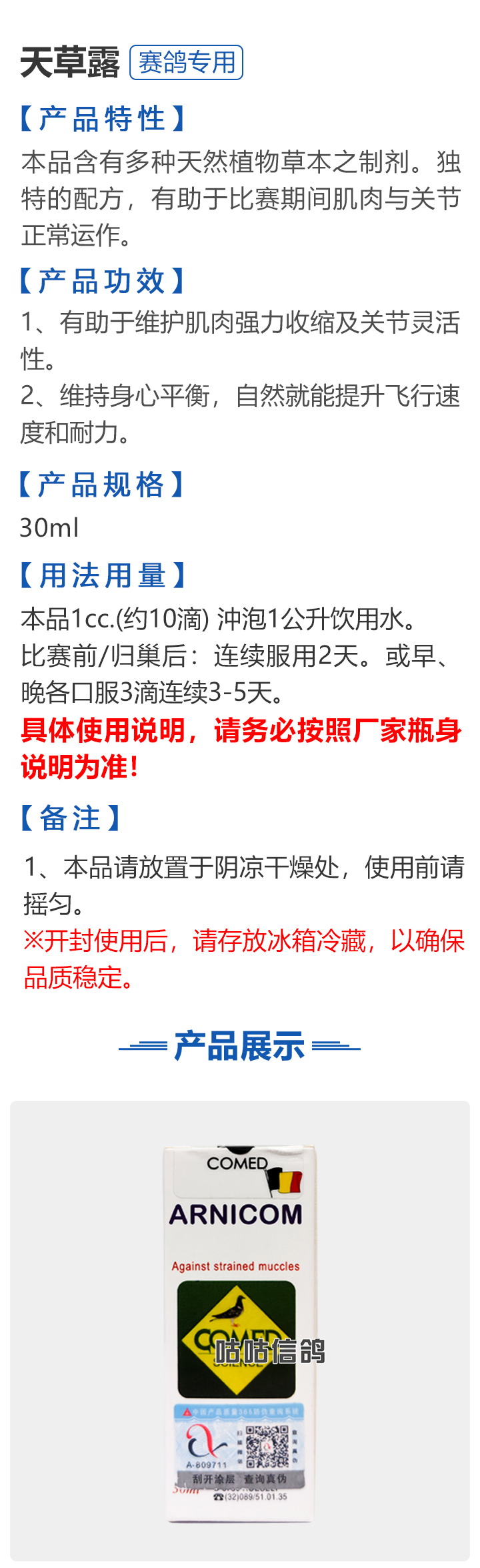 2025双节同庆•满500-40元  -  指定商品:【爆灯】蓝精零 5克×10包 蓝色电解质/抗紧迫;【爆灯】鸽滴威 5克×10包 毛滴虫/念珠菌/黄色痰丝/乳白痰丝/喉咙白点;【爆灯】莎门停 5克×10包 副伤寒/沙门氏菌/伤寒/葡萄球菌/拉稀/水便/肠道;【爆灯】高效虫灭灵 5克×10包 五种体内虫/蛔虫/线虫/鞭毛虫/球虫/绦虫/血便/打虫;【爆灯】益南混甘 5克×10包 发热/咳嗽/流泪/歪头/张口呼吸;【爆灯】滴球快克 5克×10包 毛滴虫/球虫/二合一/喉内白点/起痰;【心连心】滴莎 10克×6袋 毛滴虫/念珠菌/喉内白点/口黄绿便;【爆灯】乎滴亢 5克×10包 呼吸道/毛滴虫/2合1;【爆灯】超浓缩喜乐菌 500毫升 活菌/大肠杆菌/减少下痢/水便;【心连心】球莎 10克×6袋 升级版配方/中西结合/迅速杀灭球虫;【爆灯】维诺护肝精 250毫升 强肝解毒/消除疲劳紧迫/促进幼鸽成长/提供维生素微量元素/调节高峰状态;【爆灯】虱螨体虫清 500毫升 杀灭体外寄生虫/螨虫/羽虱/血蜘蛛/打虫/洗澡;【爆灯】球可定 100毫升 广谱抗原虫/球虫/小肠球虫/血便/飞翔下降羽毛松乱/消瘦脱水打呵欠;【爆灯】复合预混合饲料Ⅱ维益菌 227克 肠道/绿便/水便/黄便/嗉囊炎/活菌;【爆灯】肠道宝 500克 保护胃肠道/增强肝脏解毒功能/修复肠粘膜/活菌;【心连心】莎J净 10克×6袋 升级版配方中西结合/杀灭大肠杆菌/沙门氏菌;【心连心】鸽C净 10克×6袋 升级版配方中西结合体内外寄生虫;【陈永山】金牌三冠丸 300粒 职业鸽舍保健秘方/强化幼鸽骨骼;【顶峰】复合菌(胶囊)100粒 加速消化/粪便成型/增强食欲/活菌;【爱丽丝】喉痢清(加强型) 60粒(胶囊) 羽毛松散蓬乱/呼吸困难/腹泻/咽喉溃疡/呼吸道/走路失去平衡/呼吸道;【顶峰】能量钙(浓缩型) 2.5升 纳米钙/天然骨胶原蛋白/磷钙镁锌/微量元素/骨骼发育/肠道吸收/维生素;【爱丽丝】衣原净一代 60粒(胶囊) 眼部流泪/呼吸困难/喉部粘液/喘气/打喷嚏/衣原体/单眼伤风/呼吸道;【施德福】特号六合一混合剂 5克×10包 呼吸道/毛滴虫/球虫/肠道/下痢/腺病毒;【爱丽丝】毛滴虫净 60粒(胶囊) 毛滴虫/喉部黄斑/喉部粘液/口腔白点/飞行能力下降/闭眼;【爱丽丝】刹杆净(原沙门氏菌大肠杆菌杀星) 60粒(胶囊)沙门氏菌/大肠杆菌/水便/绿便/体重减轻/关节肿胀/翅膀下垂/飞不高;【爱丽丝】肝精 5克×10袋 强肝解毒/降低脂肪肝/提高免疫力/清肝明目;【施德福】卡尼丁肝肾液 250毫升 提供能量/提高视力/健脾和胃/增强体质;2026.7.2到期【施德福】精华液 250毫升 补充所需营养/维生素/恢复体力/保持巅峰/提高种鸽育种;【爱丽丝】呼吸道特号 60粒 (胶囊) 上呼吸道/口内浓痰/打喷嚏/气喘/呼吸困难/流鼻涕;【施德福】口服苗液 25毫升 肠道/呼吸道/新城疫/腺病毒/支原体/鸽瘟/六合一口服苗;【宜豪】宜豪1号免疫活菌飞速健 300锭 国际最新专利/益生菌/天然酵素/促消化/增强免疫/耐热;【宜豪】宜豪1号免疫活菌飞速健粉 800克 国际最新专利/益生菌/天然酵素/促消化/增强免疫/耐热;【天津版稳拿】稳拿二号(消化肠道) 3公克×8袋 稳拿2号/肠道/沙门氏/细菌性肠炎/下痢/紧迫性水便/消化不良/食欲不振/鼻毛耸立/发育不良/活菌;【宜豪】宜豪2号转骨钙 300锭 转骨素/钙质吸收/移行抗体增强免疫力/活性矿物质/营养补充/补钙;【天津版稳拿】稳拿七号(毛滴虫) 2公克×8袋 毛滴虫/黑鼻头/口内痰丝/喉咙白点/水便/虚弱/食欲减退/羽毛松乱/幼鸽发育不良 稳拿7号;【上海龙园】魔宝 1000克 袋装/维他矿物粉/提供钙磷等微量元素及多种必须的矿物质;【宜豪】宜豪2号转骨钙粉 800克 转骨素/钙质吸收/移行抗体增强免疫力/活性矿物质/营养补充/补钙;正版【比达斯】ASD耐力胶囊 50粒 富含B12、B15、铁/富含矿物质/增加肌肉爆发/体能耐力;正版【比达斯】康多斯(呼吸道+状态) 100克 呼吸道/状态调节/呼噜声/黑鼻;【上海龙园】维他肝精 250毫升 强肝/健肝/保肝/护肝/解毒/提高种鸽育种质量/调节体能/促高峰;【上海龙园】鸽绿茶 100克 清热解毒/清肝明目/清咽利喉/鸽感冒/消化不良/纯天然绿色植物;【宜豪】宜豪1号免疫活菌飞速健 1000粒 国际最新专利/益生菌/天然酵素/促消化/增强免疫/耐热;【上海龙园】小育雏宝胶囊 100粒 调节种鸽育种巅峰/帮助幼鸽生长;【宜豪】宜豪2号转骨钙 500锭 转骨素/钙质吸收/移行抗体增强免疫力/活性矿物质/营养补充/补钙;【上海龙园】菌乐多 500毫升 肠道健康/肠道菌平衡/抗应激/活菌;【先锋】呼喉霸 5克×10包 微浆菌/衣原体/毛滴虫/新城疫混感;【先锋】依原净 5克×10包 不爱飞/羽毛松散/吃食少/单眼流泪/绿便/呼吸道/衣原体;【宜豪】宜豪6号神奇消化活菌粉 800克 抢料/消化好/增强营养吸收/酵素/益生菌/活菌;【宜豪】宜豪6号神奇消化活菌锭 1000锭 抢料/消化好/增强营养吸收/酵素/益生菌/活菌;【宜豪】宜豪6号神奇消化活菌锭 300锭 抢料/消化好/增强营养吸收/酵素/益生菌/活菌;【宜豪】宜豪5号天然草本全方位促进剂 60毫升 代谢残留/调节肝肾功能/消除疲劳/促进食欲;【西安凯鸽】客线枉 30毫升 腺病毒/甩拉吐/绿便/甩食/呕吐/缩头;【西安凯鸽】至尊独霸 100克 新城疫/腺病毒/抗菌消炎;【西安凯鸽】至尊独霸 60粒(胶囊) 新城疫/腺病毒/抗菌消炎;【爆灯】T5鸽疫快克 20毫升 新城疫/腺病毒/疱疹病毒/鸽痘/流感/特异性免疫因子;【西安凯鸽】果蔬营养丸 700克 改善肠道/提高体能/补充维生素