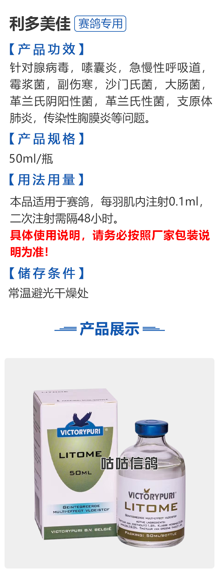 2025双节同庆•满1500-150元  -  指定商品:【爆灯】蓝精零 5克×10包 蓝色电解质/抗紧迫;【爆灯】鸽滴威 5克×10包 毛滴虫/念珠菌/黄色痰丝/乳白痰丝/喉咙白点;【爆灯】莎门停 5克×10包 副伤寒/沙门氏菌/伤寒/葡萄球菌/拉稀/水便/肠道;【爆灯】高效虫灭灵 5克×10包 五种体内虫/蛔虫/线虫/鞭毛虫/球虫/绦虫/血便/打虫;【爆灯】益南混甘 5克×10包 发热/咳嗽/流泪/歪头/张口呼吸;【爆灯】滴球快克 5克×10包 毛滴虫/球虫/二合一/喉内白点/起痰;【心连心】滴莎 10克×6袋 毛滴虫/念珠菌/喉内白点/口黄绿便;【爆灯】乎滴亢 5克×10包 呼吸道/毛滴虫/2合1;【爆灯】超浓缩喜乐菌 500毫升 活菌/大肠杆菌/减少下痢/水便;【心连心】球莎 10克×6袋 升级版配方/中西结合/迅速杀灭球虫;【爆灯】维诺护肝精 250毫升 强肝解毒/消除疲劳紧迫/促进幼鸽成长/提供维生素微量元素/调节高峰状态;【爆灯】虱螨体虫清 500毫升 杀灭体外寄生虫/螨虫/羽虱/血蜘蛛/打虫/洗澡;【爆灯】球可定 100毫升 广谱抗原虫/球虫/小肠球虫/血便/飞翔下降羽毛松乱/消瘦脱水打呵欠;【爆灯】复合预混合饲料Ⅱ维益菌 227克 肠道/绿便/水便/黄便/嗉囊炎/活菌;【爆灯】肠道宝 500克 保护胃肠道/增强肝脏解毒功能/修复肠粘膜/活菌;【心连心】莎J净 10克×6袋 升级版配方中西结合/杀灭大肠杆菌/沙门氏菌;【心连心】鸽C净 10克×6袋 升级版配方中西结合体内外寄生虫;【陈永山】金牌三冠丸 300粒 职业鸽舍保健秘方/强化幼鸽骨骼;【顶峰】复合菌(胶囊)100粒 加速消化/粪便成型/增强食欲/活菌;【爱丽丝】喉痢清(加强型) 60粒(胶囊) 羽毛松散蓬乱/呼吸困难/腹泻/咽喉溃疡/呼吸道/走路失去平衡/呼吸道;【顶峰】能量钙(浓缩型) 2.5升 纳米钙/天然骨胶原蛋白/磷钙镁锌/微量元素/骨骼发育/肠道吸收/维生素;【爱丽丝】衣原净一代 60粒(胶囊) 眼部流泪/呼吸困难/喉部粘液/喘气/打喷嚏/衣原体/单眼伤风/呼吸道;【施德福】特号六合一混合剂 5克×10包 呼吸道/毛滴虫/球虫/肠道/下痢/腺病毒;【爱丽丝】毛滴虫净 60粒(胶囊) 毛滴虫/喉部黄斑/喉部粘液/口腔白点/飞行能力下降/闭眼;【爱丽丝】刹杆净(原沙门氏菌大肠杆菌杀星) 60粒(胶囊)沙门氏菌/大肠杆菌/水便/绿便/体重减轻/关节肿胀/翅膀下垂/飞不高;【爱丽丝】肝精 5克×10袋 强肝解毒/降低脂肪肝/提高免疫力/清肝明目;【施德福】卡尼丁肝肾液 250毫升 提供能量/提高视力/健脾和胃/增强体质;2026.7.2到期【施德福】精华液 250毫升 补充所需营养/维生素/恢复体力/保持巅峰/提高种鸽育种;【爱丽丝】呼吸道特号 60粒 (胶囊) 上呼吸道/口内浓痰/打喷嚏/气喘/呼吸困难/流鼻涕;【施德福】口服苗液 25毫升 肠道/呼吸道/新城疫/腺病毒/支原体/鸽瘟/六合一口服苗;【宜豪】宜豪1号免疫活菌飞速健 300锭 国际最新专利/益生菌/天然酵素/促消化/增强免疫/耐热;【宜豪】宜豪1号免疫活菌飞速健粉 800克 国际最新专利/益生菌/天然酵素/促消化/增强免疫/耐热;【天津版稳拿】稳拿二号(消化肠道) 3公克×8袋 稳拿2号/肠道/沙门氏/细菌性肠炎/下痢/紧迫性水便/消化不良/食欲不振/鼻毛耸立/发育不良/活菌;【宜豪】宜豪2号转骨钙 300锭 转骨素/钙质吸收/移行抗体增强免疫力/活性矿物质/营养补充/补钙;【天津版稳拿】稳拿七号(毛滴虫) 2公克×8袋 毛滴虫/黑鼻头/口内痰丝/喉咙白点/水便/虚弱/食欲减退/羽毛松乱/幼鸽发育不良 稳拿7号;【上海龙园】魔宝 1000克 袋装/维他矿物粉/提供钙磷等微量元素及多种必须的矿物质;【宜豪】宜豪2号转骨钙粉 800克 转骨素/钙质吸收/移行抗体增强免疫力/活性矿物质/营养补充/补钙;正版【比达斯】ASD耐力胶囊 50粒 富含B12、B15、铁/富含矿物质/增加肌肉爆发/体能耐力;正版【比达斯】康多斯(呼吸道+状态) 100克 呼吸道/状态调节/呼噜声/黑鼻;【上海龙园】维他肝精 250毫升 强肝/健肝/保肝/护肝/解毒/提高种鸽育种质量/调节体能/促高峰;【上海龙园】鸽绿茶 100克 清热解毒/清肝明目/清咽利喉/鸽感冒/消化不良/纯天然绿色植物;【宜豪】宜豪1号免疫活菌飞速健 1000粒 国际最新专利/益生菌/天然酵素/促消化/增强免疫/耐热;【上海龙园】小育雏宝胶囊 100粒 调节种鸽育种巅峰/帮助幼鸽生长;【宜豪】宜豪2号转骨钙 500锭 转骨素/钙质吸收/移行抗体增强免疫力/活性矿物质/营养补充/补钙;【上海龙园】菌乐多 500毫升 肠道健康/肠道菌平衡/抗应激/活菌;【先锋】呼喉霸 5克×10包 微浆菌/衣原体/毛滴虫/新城疫混感;【先锋】依原净 5克×10包 不爱飞/羽毛松散/吃食少/单眼流泪/绿便/呼吸道/衣原体;【宜豪】宜豪6号神奇消化活菌粉 800克 抢料/消化好/增强营养吸收/酵素/益生菌/活菌;【宜豪】宜豪6号神奇消化活菌锭 1000锭 抢料/消化好/增强营养吸收/酵素/益生菌/活菌;【宜豪】宜豪6号神奇消化活菌锭 300锭 抢料/消化好/增强营养吸收/酵素/益生菌/活菌;【宜豪】宜豪5号天然草本全方位促进剂 60毫升 代谢残留/调节肝肾功能/消除疲劳/促进食欲;【西安凯鸽】客线枉 30毫升 腺病毒/甩拉吐/绿便/甩食/呕吐/缩头;【西安凯鸽】至尊独霸 100克 新城疫/腺病毒/抗菌消炎;【西安凯鸽】至尊独霸 60粒(胶囊) 新城疫/腺病毒/抗菌消炎;【爆灯】T5鸽疫快克 20毫升 新城疫/腺病毒/疱疹病毒/鸽痘/流感/特异性免疫因子;【西安凯鸽】果蔬营养丸 700克 改善肠道/提高体能/补充维生