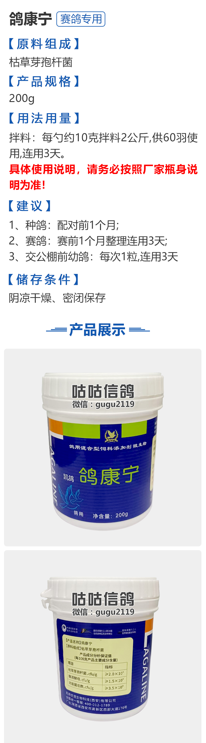 2025双节同庆•满1500-150元  -  指定商品:【爆灯】蓝精零 5克×10包 蓝色电解质/抗紧迫;【爆灯】鸽滴威 5克×10包 毛滴虫/念珠菌/黄色痰丝/乳白痰丝/喉咙白点;【爆灯】莎门停 5克×10包 副伤寒/沙门氏菌/伤寒/葡萄球菌/拉稀/水便/肠道;【爆灯】高效虫灭灵 5克×10包 五种体内虫/蛔虫/线虫/鞭毛虫/球虫/绦虫/血便/打虫;【爆灯】益南混甘 5克×10包 发热/咳嗽/流泪/歪头/张口呼吸;【爆灯】滴球快克 5克×10包 毛滴虫/球虫/二合一/喉内白点/起痰;【心连心】滴莎 10克×6袋 毛滴虫/念珠菌/喉内白点/口黄绿便;【爆灯】乎滴亢 5克×10包 呼吸道/毛滴虫/2合1;【爆灯】超浓缩喜乐菌 500毫升 活菌/大肠杆菌/减少下痢/水便;【心连心】球莎 10克×6袋 升级版配方/中西结合/迅速杀灭球虫;【爆灯】维诺护肝精 250毫升 强肝解毒/消除疲劳紧迫/促进幼鸽成长/提供维生素微量元素/调节高峰状态;【爆灯】虱螨体虫清 500毫升 杀灭体外寄生虫/螨虫/羽虱/血蜘蛛/打虫/洗澡;【爆灯】球可定 100毫升 广谱抗原虫/球虫/小肠球虫/血便/飞翔下降羽毛松乱/消瘦脱水打呵欠;【爆灯】复合预混合饲料Ⅱ维益菌 227克 肠道/绿便/水便/黄便/嗉囊炎/活菌;【爆灯】肠道宝 500克 保护胃肠道/增强肝脏解毒功能/修复肠粘膜/活菌;【心连心】莎J净 10克×6袋 升级版配方中西结合/杀灭大肠杆菌/沙门氏菌;【心连心】鸽C净 10克×6袋 升级版配方中西结合体内外寄生虫;【陈永山】金牌三冠丸 300粒 职业鸽舍保健秘方/强化幼鸽骨骼;【顶峰】复合菌(胶囊)100粒 加速消化/粪便成型/增强食欲/活菌;【爱丽丝】喉痢清(加强型) 60粒(胶囊) 羽毛松散蓬乱/呼吸困难/腹泻/咽喉溃疡/呼吸道/走路失去平衡/呼吸道;【顶峰】能量钙(浓缩型) 2.5升 纳米钙/天然骨胶原蛋白/磷钙镁锌/微量元素/骨骼发育/肠道吸收/维生素;【爱丽丝】衣原净一代 60粒(胶囊) 眼部流泪/呼吸困难/喉部粘液/喘气/打喷嚏/衣原体/单眼伤风/呼吸道;【施德福】特号六合一混合剂 5克×10包 呼吸道/毛滴虫/球虫/肠道/下痢/腺病毒;【爱丽丝】毛滴虫净 60粒(胶囊) 毛滴虫/喉部黄斑/喉部粘液/口腔白点/飞行能力下降/闭眼;【爱丽丝】刹杆净(原沙门氏菌大肠杆菌杀星) 60粒(胶囊)沙门氏菌/大肠杆菌/水便/绿便/体重减轻/关节肿胀/翅膀下垂/飞不高;【爱丽丝】肝精 5克×10袋 强肝解毒/降低脂肪肝/提高免疫力/清肝明目;【施德福】卡尼丁肝肾液 250毫升 提供能量/提高视力/健脾和胃/增强体质;2026.7.2到期【施德福】精华液 250毫升 补充所需营养/维生素/恢复体力/保持巅峰/提高种鸽育种;【爱丽丝】呼吸道特号 60粒 (胶囊) 上呼吸道/口内浓痰/打喷嚏/气喘/呼吸困难/流鼻涕;【施德福】口服苗液 25毫升 肠道/呼吸道/新城疫/腺病毒/支原体/鸽瘟/六合一口服苗;【宜豪】宜豪1号免疫活菌飞速健 300锭 国际最新专利/益生菌/天然酵素/促消化/增强免疫/耐热;【宜豪】宜豪1号免疫活菌飞速健粉 800克 国际最新专利/益生菌/天然酵素/促消化/增强免疫/耐热;【天津版稳拿】稳拿二号(消化肠道) 3公克×8袋 稳拿2号/肠道/沙门氏/细菌性肠炎/下痢/紧迫性水便/消化不良/食欲不振/鼻毛耸立/发育不良/活菌;【宜豪】宜豪2号转骨钙 300锭 转骨素/钙质吸收/移行抗体增强免疫力/活性矿物质/营养补充/补钙;【天津版稳拿】稳拿七号(毛滴虫) 2公克×8袋 毛滴虫/黑鼻头/口内痰丝/喉咙白点/水便/虚弱/食欲减退/羽毛松乱/幼鸽发育不良 稳拿7号;【上海龙园】魔宝 1000克 袋装/维他矿物粉/提供钙磷等微量元素及多种必须的矿物质;【宜豪】宜豪2号转骨钙粉 800克 转骨素/钙质吸收/移行抗体增强免疫力/活性矿物质/营养补充/补钙;正版【比达斯】ASD耐力胶囊 50粒 富含B12、B15、铁/富含矿物质/增加肌肉爆发/体能耐力;正版【比达斯】康多斯(呼吸道+状态) 100克 呼吸道/状态调节/呼噜声/黑鼻;【上海龙园】维他肝精 250毫升 强肝/健肝/保肝/护肝/解毒/提高种鸽育种质量/调节体能/促高峰;【上海龙园】鸽绿茶 100克 清热解毒/清肝明目/清咽利喉/鸽感冒/消化不良/纯天然绿色植物;【宜豪】宜豪1号免疫活菌飞速健 1000粒 国际最新专利/益生菌/天然酵素/促消化/增强免疫/耐热;【上海龙园】小育雏宝胶囊 100粒 调节种鸽育种巅峰/帮助幼鸽生长;【宜豪】宜豪2号转骨钙 500锭 转骨素/钙质吸收/移行抗体增强免疫力/活性矿物质/营养补充/补钙;【上海龙园】菌乐多 500毫升 肠道健康/肠道菌平衡/抗应激/活菌;【先锋】呼喉霸 5克×10包 微浆菌/衣原体/毛滴虫/新城疫混感;【先锋】依原净 5克×10包 不爱飞/羽毛松散/吃食少/单眼流泪/绿便/呼吸道/衣原体;【宜豪】宜豪6号神奇消化活菌粉 800克 抢料/消化好/增强营养吸收/酵素/益生菌/活菌;【宜豪】宜豪6号神奇消化活菌锭 1000锭 抢料/消化好/增强营养吸收/酵素/益生菌/活菌;【宜豪】宜豪6号神奇消化活菌锭 300锭 抢料/消化好/增强营养吸收/酵素/益生菌/活菌;【宜豪】宜豪5号天然草本全方位促进剂 60毫升 代谢残留/调节肝肾功能/消除疲劳/促进食欲;【西安凯鸽】客线枉 30毫升 腺病毒/甩拉吐/绿便/甩食/呕吐/缩头;【西安凯鸽】至尊独霸 100克 新城疫/腺病毒/抗菌消炎;【西安凯鸽】至尊独霸 60粒(胶囊) 新城疫/腺病毒/抗菌消炎;【爆灯】T5鸽疫快克 20毫升 新城疫/腺病毒/疱疹病毒/鸽痘/流感/特异性免疫因子;【西安凯鸽】果蔬营养丸 700克 改善肠道/提高体能/补充维生