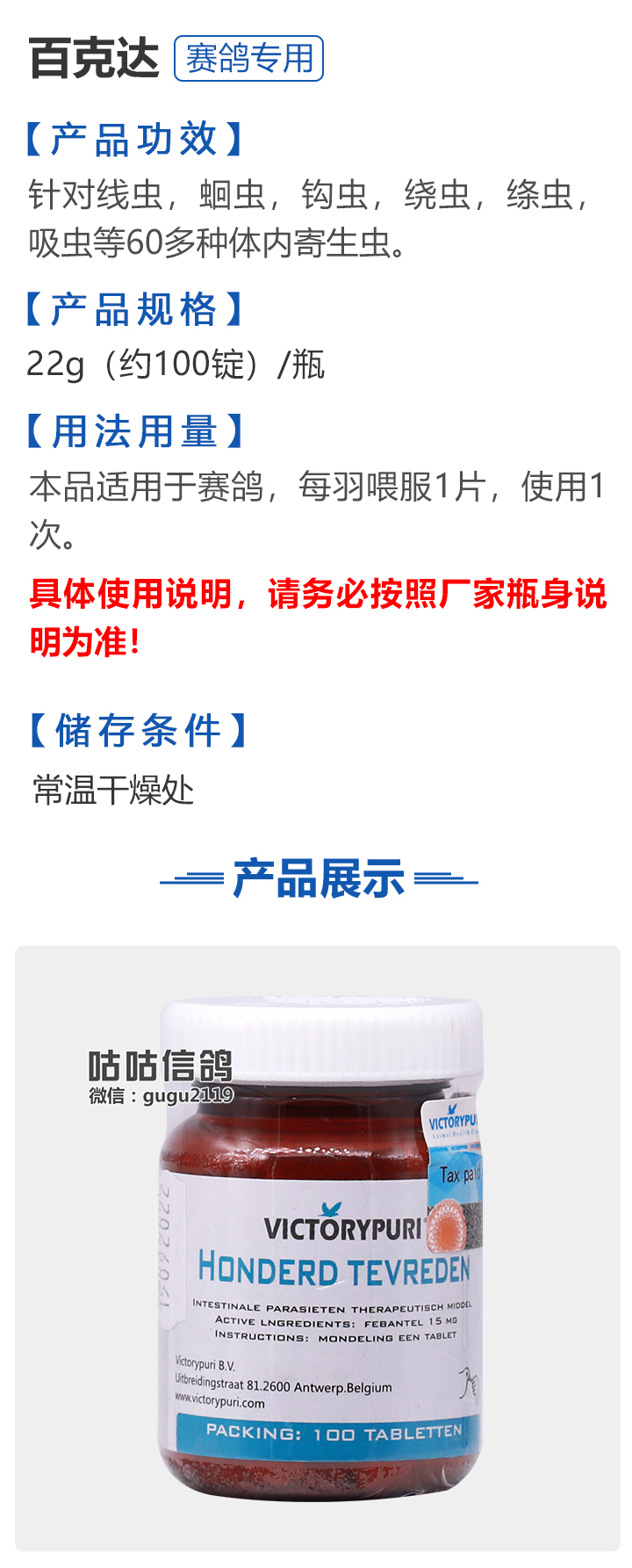 2025双节同庆•满1000-90元  -  指定商品:【爆灯】蓝精零 5克×10包 蓝色电解质/抗紧迫;【爆灯】鸽滴威 5克×10包 毛滴虫/念珠菌/黄色痰丝/乳白痰丝/喉咙白点;【爆灯】莎门停 5克×10包 副伤寒/沙门氏菌/伤寒/葡萄球菌/拉稀/水便/肠道;【爆灯】高效虫灭灵 5克×10包 五种体内虫/蛔虫/线虫/鞭毛虫/球虫/绦虫/血便/打虫;【爆灯】益南混甘 5克×10包 发热/咳嗽/流泪/歪头/张口呼吸;【爆灯】滴球快克 5克×10包 毛滴虫/球虫/二合一/喉内白点/起痰;【心连心】滴莎 10克×6袋 毛滴虫/念珠菌/喉内白点/口黄绿便;【爆灯】乎滴亢 5克×10包 呼吸道/毛滴虫/2合1;【爆灯】超浓缩喜乐菌 500毫升 活菌/大肠杆菌/减少下痢/水便;【心连心】球莎 10克×6袋 升级版配方/中西结合/迅速杀灭球虫;【爆灯】维诺护肝精 250毫升 强肝解毒/消除疲劳紧迫/促进幼鸽成长/提供维生素微量元素/调节高峰状态;【爆灯】虱螨体虫清 500毫升 杀灭体外寄生虫/螨虫/羽虱/血蜘蛛/打虫/洗澡;【爆灯】球可定 100毫升 广谱抗原虫/球虫/小肠球虫/血便/飞翔下降羽毛松乱/消瘦脱水打呵欠;【爆灯】复合预混合饲料Ⅱ维益菌 227克 肠道/绿便/水便/黄便/嗉囊炎/活菌;【爆灯】肠道宝 500克 保护胃肠道/增强肝脏解毒功能/修复肠粘膜/活菌;【心连心】莎J净 10克×6袋 升级版配方中西结合/杀灭大肠杆菌/沙门氏菌;【心连心】鸽C净 10克×6袋 升级版配方中西结合体内外寄生虫;【陈永山】金牌三冠丸 300粒 职业鸽舍保健秘方/强化幼鸽骨骼;【顶峰】复合菌(胶囊)100粒 加速消化/粪便成型/增强食欲/活菌;【爱丽丝】喉痢清(加强型) 60粒(胶囊) 羽毛松散蓬乱/呼吸困难/腹泻/咽喉溃疡/呼吸道/走路失去平衡/呼吸道;【顶峰】能量钙(浓缩型) 2.5升 纳米钙/天然骨胶原蛋白/磷钙镁锌/微量元素/骨骼发育/肠道吸收/维生素;【爱丽丝】衣原净一代 60粒(胶囊) 眼部流泪/呼吸困难/喉部粘液/喘气/打喷嚏/衣原体/单眼伤风/呼吸道;【施德福】特号六合一混合剂 5克×10包 呼吸道/毛滴虫/球虫/肠道/下痢/腺病毒;【爱丽丝】毛滴虫净 60粒(胶囊) 毛滴虫/喉部黄斑/喉部粘液/口腔白点/飞行能力下降/闭眼;【爱丽丝】刹杆净(原沙门氏菌大肠杆菌杀星) 60粒(胶囊)沙门氏菌/大肠杆菌/水便/绿便/体重减轻/关节肿胀/翅膀下垂/飞不高;【爱丽丝】肝精 5克×10袋 强肝解毒/降低脂肪肝/提高免疫力/清肝明目;【施德福】卡尼丁肝肾液 250毫升 提供能量/提高视力/健脾和胃/增强体质;2026.7.2到期【施德福】精华液 250毫升 补充所需营养/维生素/恢复体力/保持巅峰/提高种鸽育种;【爱丽丝】呼吸道特号 60粒 (胶囊) 上呼吸道/口内浓痰/打喷嚏/气喘/呼吸困难/流鼻涕;【施德福】口服苗液 25毫升 肠道/呼吸道/新城疫/腺病毒/支原体/鸽瘟/六合一口服苗;【宜豪】宜豪1号免疫活菌飞速健 300锭 国际最新专利/益生菌/天然酵素/促消化/增强免疫/耐热;【宜豪】宜豪1号免疫活菌飞速健粉 800克 国际最新专利/益生菌/天然酵素/促消化/增强免疫/耐热;【天津版稳拿】稳拿二号(消化肠道) 3公克×8袋 稳拿2号/肠道/沙门氏/细菌性肠炎/下痢/紧迫性水便/消化不良/食欲不振/鼻毛耸立/发育不良/活菌;【宜豪】宜豪2号转骨钙 300锭 转骨素/钙质吸收/移行抗体增强免疫力/活性矿物质/营养补充/补钙;【天津版稳拿】稳拿七号(毛滴虫) 2公克×8袋 毛滴虫/黑鼻头/口内痰丝/喉咙白点/水便/虚弱/食欲减退/羽毛松乱/幼鸽发育不良 稳拿7号;【上海龙园】魔宝 1000克 袋装/维他矿物粉/提供钙磷等微量元素及多种必须的矿物质;【宜豪】宜豪2号转骨钙粉 800克 转骨素/钙质吸收/移行抗体增强免疫力/活性矿物质/营养补充/补钙;正版【比达斯】ASD耐力胶囊 50粒 富含B12、B15、铁/富含矿物质/增加肌肉爆发/体能耐力;正版【比达斯】康多斯(呼吸道+状态) 100克 呼吸道/状态调节/呼噜声/黑鼻;【上海龙园】维他肝精 250毫升 强肝/健肝/保肝/护肝/解毒/提高种鸽育种质量/调节体能/促高峰;【上海龙园】鸽绿茶 100克 清热解毒/清肝明目/清咽利喉/鸽感冒/消化不良/纯天然绿色植物;【宜豪】宜豪1号免疫活菌飞速健 1000粒 国际最新专利/益生菌/天然酵素/促消化/增强免疫/耐热;【上海龙园】小育雏宝胶囊 100粒 调节种鸽育种巅峰/帮助幼鸽生长;【宜豪】宜豪2号转骨钙 500锭 转骨素/钙质吸收/移行抗体增强免疫力/活性矿物质/营养补充/补钙;【上海龙园】菌乐多 500毫升 肠道健康/肠道菌平衡/抗应激/活菌;【先锋】呼喉霸 5克×10包 微浆菌/衣原体/毛滴虫/新城疫混感;【先锋】依原净 5克×10包 不爱飞/羽毛松散/吃食少/单眼流泪/绿便/呼吸道/衣原体;【宜豪】宜豪6号神奇消化活菌粉 800克 抢料/消化好/增强营养吸收/酵素/益生菌/活菌;【宜豪】宜豪6号神奇消化活菌锭 1000锭 抢料/消化好/增强营养吸收/酵素/益生菌/活菌;【宜豪】宜豪6号神奇消化活菌锭 300锭 抢料/消化好/增强营养吸收/酵素/益生菌/活菌;【宜豪】宜豪5号天然草本全方位促进剂 60毫升 代谢残留/调节肝肾功能/消除疲劳/促进食欲;【西安凯鸽】客线枉 30毫升 腺病毒/甩拉吐/绿便/甩食/呕吐/缩头;【西安凯鸽】至尊独霸 100克 新城疫/腺病毒/抗菌消炎;【西安凯鸽】至尊独霸 60粒(胶囊) 新城疫/腺病毒/抗菌消炎;【爆灯】T5鸽疫快克 20毫升 新城疫/腺病毒/疱疹病毒/鸽痘/流感/特异性免疫因子;【西安凯鸽】果蔬营养丸 700克 改善肠道/提高体能/补充维生