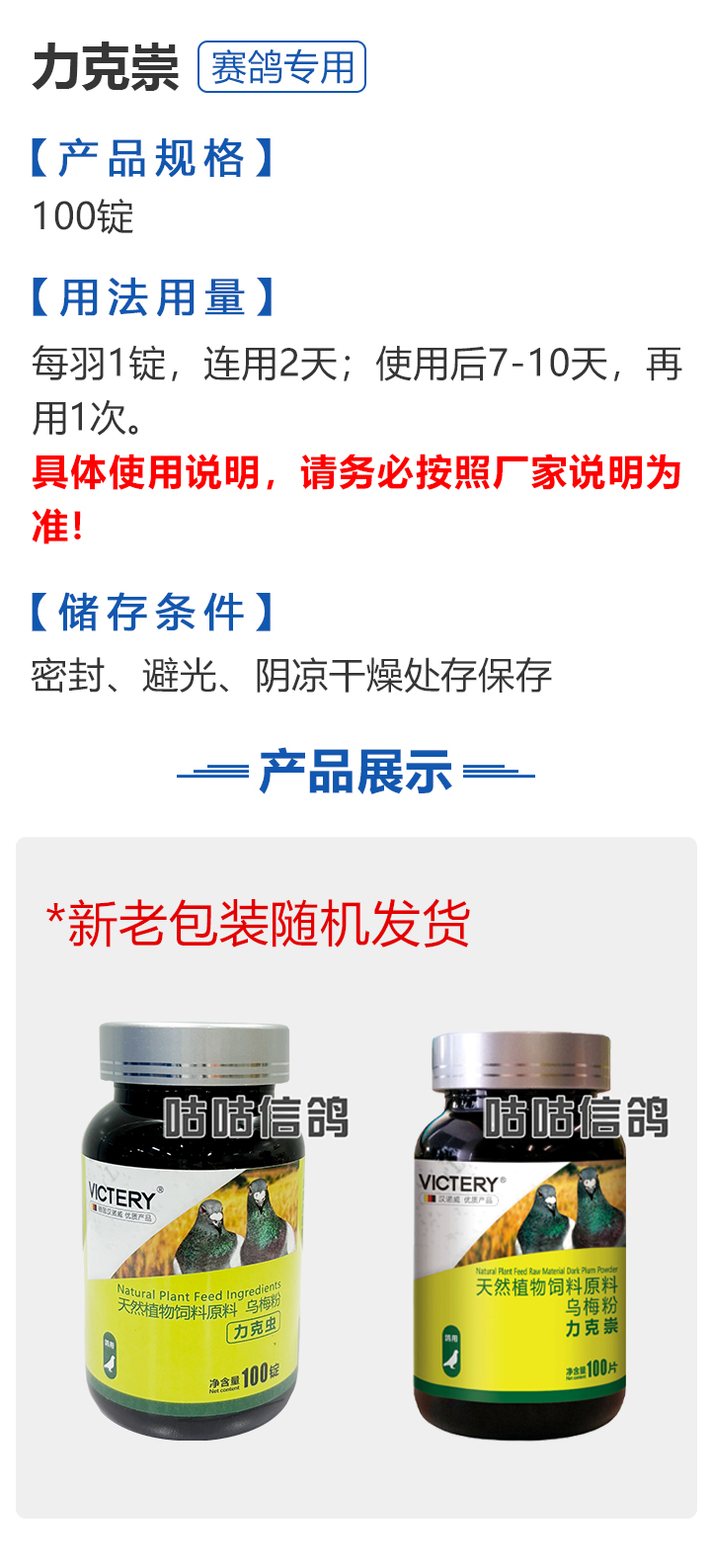 2025双节同庆•满1000-90元  -  指定商品:【爆灯】蓝精零 5克×10包 蓝色电解质/抗紧迫;【爆灯】鸽滴威 5克×10包 毛滴虫/念珠菌/黄色痰丝/乳白痰丝/喉咙白点;【爆灯】莎门停 5克×10包 副伤寒/沙门氏菌/伤寒/葡萄球菌/拉稀/水便/肠道;【爆灯】高效虫灭灵 5克×10包 五种体内虫/蛔虫/线虫/鞭毛虫/球虫/绦虫/血便/打虫;【爆灯】益南混甘 5克×10包 发热/咳嗽/流泪/歪头/张口呼吸;【爆灯】滴球快克 5克×10包 毛滴虫/球虫/二合一/喉内白点/起痰;【心连心】滴莎 10克×6袋 毛滴虫/念珠菌/喉内白点/口黄绿便;【爆灯】乎滴亢 5克×10包 呼吸道/毛滴虫/2合1;【爆灯】超浓缩喜乐菌 500毫升 活菌/大肠杆菌/减少下痢/水便;【心连心】球莎 10克×6袋 升级版配方/中西结合/迅速杀灭球虫;【爆灯】维诺护肝精 250毫升 强肝解毒/消除疲劳紧迫/促进幼鸽成长/提供维生素微量元素/调节高峰状态;【爆灯】虱螨体虫清 500毫升 杀灭体外寄生虫/螨虫/羽虱/血蜘蛛/打虫/洗澡;【爆灯】球可定 100毫升 广谱抗原虫/球虫/小肠球虫/血便/飞翔下降羽毛松乱/消瘦脱水打呵欠;【爆灯】复合预混合饲料Ⅱ维益菌 227克 肠道/绿便/水便/黄便/嗉囊炎/活菌;【爆灯】肠道宝 500克 保护胃肠道/增强肝脏解毒功能/修复肠粘膜/活菌;【心连心】莎J净 10克×6袋 升级版配方中西结合/杀灭大肠杆菌/沙门氏菌;【心连心】鸽C净 10克×6袋 升级版配方中西结合体内外寄生虫;【陈永山】金牌三冠丸 300粒 职业鸽舍保健秘方/强化幼鸽骨骼;【顶峰】复合菌(胶囊)100粒 加速消化/粪便成型/增强食欲/活菌;【爱丽丝】喉痢清(加强型) 60粒(胶囊) 羽毛松散蓬乱/呼吸困难/腹泻/咽喉溃疡/呼吸道/走路失去平衡/呼吸道;【顶峰】能量钙(浓缩型) 2.5升 纳米钙/天然骨胶原蛋白/磷钙镁锌/微量元素/骨骼发育/肠道吸收/维生素;【爱丽丝】衣原净一代 60粒(胶囊) 眼部流泪/呼吸困难/喉部粘液/喘气/打喷嚏/衣原体/单眼伤风/呼吸道;【施德福】特号六合一混合剂 5克×10包 呼吸道/毛滴虫/球虫/肠道/下痢/腺病毒;【爱丽丝】毛滴虫净 60粒(胶囊) 毛滴虫/喉部黄斑/喉部粘液/口腔白点/飞行能力下降/闭眼;【爱丽丝】刹杆净(原沙门氏菌大肠杆菌杀星) 60粒(胶囊)沙门氏菌/大肠杆菌/水便/绿便/体重减轻/关节肿胀/翅膀下垂/飞不高;【爱丽丝】肝精 5克×10袋 强肝解毒/降低脂肪肝/提高免疫力/清肝明目;【施德福】卡尼丁肝肾液 250毫升 提供能量/提高视力/健脾和胃/增强体质;2026.7.2到期【施德福】精华液 250毫升 补充所需营养/维生素/恢复体力/保持巅峰/提高种鸽育种;【爱丽丝】呼吸道特号 60粒 (胶囊) 上呼吸道/口内浓痰/打喷嚏/气喘/呼吸困难/流鼻涕;【施德福】口服苗液 25毫升 肠道/呼吸道/新城疫/腺病毒/支原体/鸽瘟/六合一口服苗;【宜豪】宜豪1号免疫活菌飞速健 300锭 国际最新专利/益生菌/天然酵素/促消化/增强免疫/耐热;【宜豪】宜豪1号免疫活菌飞速健粉 800克 国际最新专利/益生菌/天然酵素/促消化/增强免疫/耐热;【天津版稳拿】稳拿二号(消化肠道) 3公克×8袋 稳拿2号/肠道/沙门氏/细菌性肠炎/下痢/紧迫性水便/消化不良/食欲不振/鼻毛耸立/发育不良/活菌;【宜豪】宜豪2号转骨钙 300锭 转骨素/钙质吸收/移行抗体增强免疫力/活性矿物质/营养补充/补钙;【天津版稳拿】稳拿七号(毛滴虫) 2公克×8袋 毛滴虫/黑鼻头/口内痰丝/喉咙白点/水便/虚弱/食欲减退/羽毛松乱/幼鸽发育不良 稳拿7号;【上海龙园】魔宝 1000克 袋装/维他矿物粉/提供钙磷等微量元素及多种必须的矿物质;【宜豪】宜豪2号转骨钙粉 800克 转骨素/钙质吸收/移行抗体增强免疫力/活性矿物质/营养补充/补钙;正版【比达斯】ASD耐力胶囊 50粒 富含B12、B15、铁/富含矿物质/增加肌肉爆发/体能耐力;正版【比达斯】康多斯(呼吸道+状态) 100克 呼吸道/状态调节/呼噜声/黑鼻;【上海龙园】维他肝精 250毫升 强肝/健肝/保肝/护肝/解毒/提高种鸽育种质量/调节体能/促高峰;【上海龙园】鸽绿茶 100克 清热解毒/清肝明目/清咽利喉/鸽感冒/消化不良/纯天然绿色植物;【宜豪】宜豪1号免疫活菌飞速健 1000粒 国际最新专利/益生菌/天然酵素/促消化/增强免疫/耐热;【上海龙园】小育雏宝胶囊 100粒 调节种鸽育种巅峰/帮助幼鸽生长;【宜豪】宜豪2号转骨钙 500锭 转骨素/钙质吸收/移行抗体增强免疫力/活性矿物质/营养补充/补钙;【上海龙园】菌乐多 500毫升 肠道健康/肠道菌平衡/抗应激/活菌;【先锋】呼喉霸 5克×10包 微浆菌/衣原体/毛滴虫/新城疫混感;【先锋】依原净 5克×10包 不爱飞/羽毛松散/吃食少/单眼流泪/绿便/呼吸道/衣原体;【宜豪】宜豪6号神奇消化活菌粉 800克 抢料/消化好/增强营养吸收/酵素/益生菌/活菌;【宜豪】宜豪6号神奇消化活菌锭 1000锭 抢料/消化好/增强营养吸收/酵素/益生菌/活菌;【宜豪】宜豪6号神奇消化活菌锭 300锭 抢料/消化好/增强营养吸收/酵素/益生菌/活菌;【宜豪】宜豪5号天然草本全方位促进剂 60毫升 代谢残留/调节肝肾功能/消除疲劳/促进食欲;【西安凯鸽】客线枉 30毫升 腺病毒/甩拉吐/绿便/甩食/呕吐/缩头;【西安凯鸽】至尊独霸 100克 新城疫/腺病毒/抗菌消炎;【西安凯鸽】至尊独霸 60粒(胶囊) 新城疫/腺病毒/抗菌消炎;【爆灯】T5鸽疫快克 20毫升 新城疫/腺病毒/疱疹病毒/鸽痘/流感/特异性免疫因子;【西安凯鸽】果蔬营养丸 700克 改善肠道/提高体能/补充维生