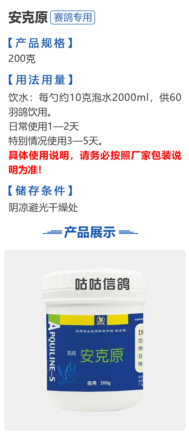 2025双节同庆•满200-15元  -  指定商品:【爆灯】蓝精零 5克×10包 蓝色电解质/抗紧迫;【爆灯】鸽滴威 5克×10包 毛滴虫/念珠菌/黄色痰丝/乳白痰丝/喉咙白点;【爆灯】莎门停 5克×10包 副伤寒/沙门氏菌/伤寒/葡萄球菌/拉稀/水便/肠道;【爆灯】高效虫灭灵 5克×10包 五种体内虫/蛔虫/线虫/鞭毛虫/球虫/绦虫/血便/打虫;【爆灯】益南混甘 5克×10包 发热/咳嗽/流泪/歪头/张口呼吸;【爆灯】滴球快克 5克×10包 毛滴虫/球虫/二合一/喉内白点/起痰;【心连心】滴莎 10克×6袋 毛滴虫/念珠菌/喉内白点/口黄绿便;【爆灯】乎滴亢 5克×10包 呼吸道/毛滴虫/2合1;【爆灯】超浓缩喜乐菌 500毫升 活菌/大肠杆菌/减少下痢/水便;【心连心】球莎 10克×6袋 升级版配方/中西结合/迅速杀灭球虫;【爆灯】维诺护肝精 250毫升 强肝解毒/消除疲劳紧迫/促进幼鸽成长/提供维生素微量元素/调节高峰状态;【爆灯】虱螨体虫清 500毫升 杀灭体外寄生虫/螨虫/羽虱/血蜘蛛/打虫/洗澡;【爆灯】球可定 100毫升 广谱抗原虫/球虫/小肠球虫/血便/飞翔下降羽毛松乱/消瘦脱水打呵欠;【爆灯】复合预混合饲料Ⅱ维益菌 227克 肠道/绿便/水便/黄便/嗉囊炎/活菌;【爆灯】肠道宝 500克 保护胃肠道/增强肝脏解毒功能/修复肠粘膜/活菌;【心连心】莎J净 10克×6袋 升级版配方中西结合/杀灭大肠杆菌/沙门氏菌;【心连心】鸽C净 10克×6袋 升级版配方中西结合体内外寄生虫;【陈永山】金牌三冠丸 300粒 职业鸽舍保健秘方/强化幼鸽骨骼;【顶峰】复合菌(胶囊)100粒 加速消化/粪便成型/增强食欲/活菌;【爱丽丝】喉痢清(加强型) 60粒(胶囊) 羽毛松散蓬乱/呼吸困难/腹泻/咽喉溃疡/呼吸道/走路失去平衡/呼吸道;【顶峰】能量钙(浓缩型) 2.5升 纳米钙/天然骨胶原蛋白/磷钙镁锌/微量元素/骨骼发育/肠道吸收/维生素;【爱丽丝】衣原净一代 60粒(胶囊) 眼部流泪/呼吸困难/喉部粘液/喘气/打喷嚏/衣原体/单眼伤风/呼吸道;【施德福】特号六合一混合剂 5克×10包 呼吸道/毛滴虫/球虫/肠道/下痢/腺病毒;【爱丽丝】毛滴虫净 60粒(胶囊) 毛滴虫/喉部黄斑/喉部粘液/口腔白点/飞行能力下降/闭眼;【爱丽丝】刹杆净(原沙门氏菌大肠杆菌杀星) 60粒(胶囊)沙门氏菌/大肠杆菌/水便/绿便/体重减轻/关节肿胀/翅膀下垂/飞不高;【爱丽丝】肝精 5克×10袋 强肝解毒/降低脂肪肝/提高免疫力/清肝明目;【施德福】卡尼丁肝肾液 250毫升 提供能量/提高视力/健脾和胃/增强体质;2026.7.2到期【施德福】精华液 250毫升 补充所需营养/维生素/恢复体力/保持巅峰/提高种鸽育种;【爱丽丝】呼吸道特号 60粒 (胶囊) 上呼吸道/口内浓痰/打喷嚏/气喘/呼吸困难/流鼻涕;【施德福】口服苗液 25毫升 肠道/呼吸道/新城疫/腺病毒/支原体/鸽瘟/六合一口服苗;【宜豪】宜豪1号免疫活菌飞速健 300锭 国际最新专利/益生菌/天然酵素/促消化/增强免疫/耐热;【宜豪】宜豪1号免疫活菌飞速健粉 800克 国际最新专利/益生菌/天然酵素/促消化/增强免疫/耐热;【天津版稳拿】稳拿二号(消化肠道) 3公克×8袋 稳拿2号/肠道/沙门氏/细菌性肠炎/下痢/紧迫性水便/消化不良/食欲不振/鼻毛耸立/发育不良/活菌;【宜豪】宜豪2号转骨钙 300锭 转骨素/钙质吸收/移行抗体增强免疫力/活性矿物质/营养补充/补钙;【天津版稳拿】稳拿七号(毛滴虫) 2公克×8袋 毛滴虫/黑鼻头/口内痰丝/喉咙白点/水便/虚弱/食欲减退/羽毛松乱/幼鸽发育不良 稳拿7号;【上海龙园】魔宝 1000克 袋装/维他矿物粉/提供钙磷等微量元素及多种必须的矿物质;【宜豪】宜豪2号转骨钙粉 800克 转骨素/钙质吸收/移行抗体增强免疫力/活性矿物质/营养补充/补钙;正版【比达斯】ASD耐力胶囊 50粒 富含B12、B15、铁/富含矿物质/增加肌肉爆发/体能耐力;正版【比达斯】康多斯(呼吸道+状态) 100克 呼吸道/状态调节/呼噜声/黑鼻;【上海龙园】维他肝精 250毫升 强肝/健肝/保肝/护肝/解毒/提高种鸽育种质量/调节体能/促高峰;【上海龙园】鸽绿茶 100克 清热解毒/清肝明目/清咽利喉/鸽感冒/消化不良/纯天然绿色植物;【宜豪】宜豪1号免疫活菌飞速健 1000粒 国际最新专利/益生菌/天然酵素/促消化/增强免疫/耐热;【上海龙园】小育雏宝胶囊 100粒 调节种鸽育种巅峰/帮助幼鸽生长;【宜豪】宜豪2号转骨钙 500锭 转骨素/钙质吸收/移行抗体增强免疫力/活性矿物质/营养补充/补钙;【上海龙园】菌乐多 500毫升 肠道健康/肠道菌平衡/抗应激/活菌;【先锋】呼喉霸 5克×10包 微浆菌/衣原体/毛滴虫/新城疫混感;【先锋】依原净 5克×10包 不爱飞/羽毛松散/吃食少/单眼流泪/绿便/呼吸道/衣原体;【宜豪】宜豪6号神奇消化活菌粉 800克 抢料/消化好/增强营养吸收/酵素/益生菌/活菌;【宜豪】宜豪6号神奇消化活菌锭 1000锭 抢料/消化好/增强营养吸收/酵素/益生菌/活菌;【宜豪】宜豪6号神奇消化活菌锭 300锭 抢料/消化好/增强营养吸收/酵素/益生菌/活菌;【宜豪】宜豪5号天然草本全方位促进剂 60毫升 代谢残留/调节肝肾功能/消除疲劳/促进食欲;【西安凯鸽】客线枉 30毫升 腺病毒/甩拉吐/绿便/甩食/呕吐/缩头;【西安凯鸽】至尊独霸 100克 新城疫/腺病毒/抗菌消炎;【西安凯鸽】至尊独霸 60粒(胶囊) 新城疫/腺病毒/抗菌消炎;【爆灯】T5鸽疫快克 20毫升 新城疫/腺病毒/疱疹病毒/鸽痘/流感/特异性免疫因子;【西安凯鸽】果蔬营养丸 700克 改善肠道/提高体能/补充维生素