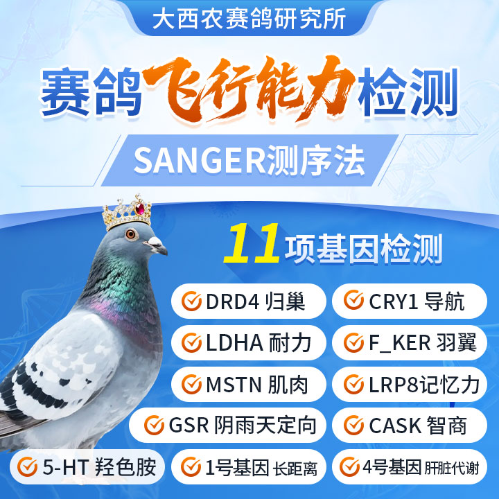【基因检测】11项指标检测:归巢毅力/耐力/肌肉/羽翼/定向导航/学习和记忆力/智商/磁感、阴天定向/大脑神经发育/长距离比赛/肝脏代谢